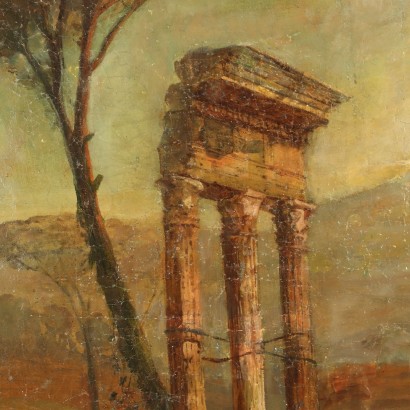 Huile sur toile. École européenne du XIXe siècle. Dans le style typique du néoclassicisme, le tableau représente un paysage avec les vestiges d'un temple classique, dans lequel sont assis des personnages en habits grecs ou romains, qui écoutent le vieillard discuter et enseigner. Ce type de peinture était destiné à représenter une idéalisation de l'Italie ancienne, en mettant en scène ses vestiges classiques. La peinture a été retouchée ; elle présente une fissure prononcée.