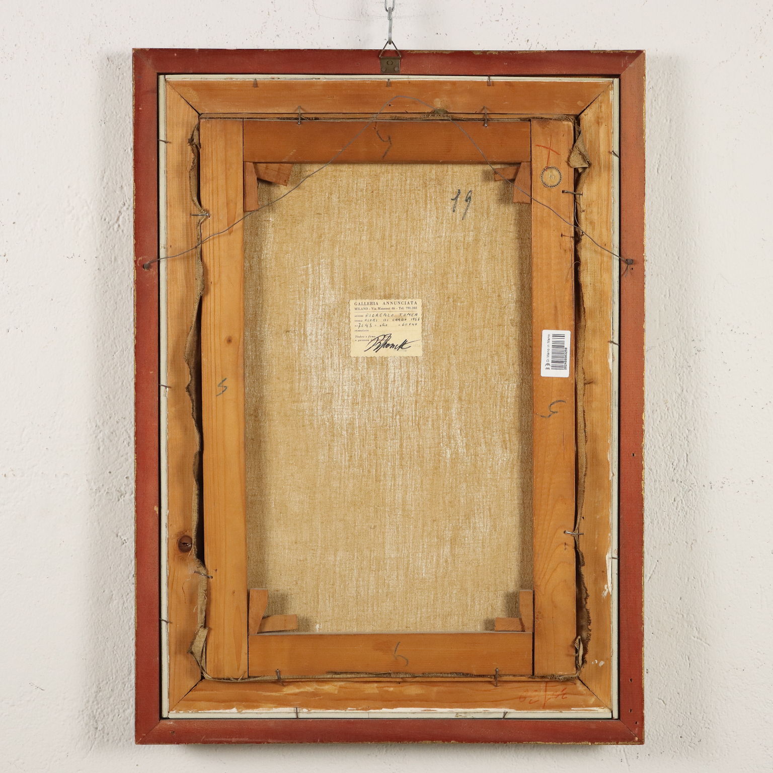 Huile sur toile. Signée en bas à gauche. Au dos, une étiquette de la Galleria Annunciata de Milan indique le titre et la date de l'œuvre. Fiorenzo Tomea a produit un grand nombre de fleurs, surtout dans les années 1950, soit dans des vases, soit isolées. Ce sujet était un thème traditionnel dans les peintures de De Pisis et de Mafai dans les mêmes années, et il a voulu proposer une réflexion sur la vanité, c'est-à-dire sur le caractère éphémère de la vie. Les fleurs séchées, dénudées, isolées les unes des autres, suspendues dans une atmosphère livide, presque surréaliste, traduisent un sentiment de défaite et d'éloignement. L'œuvre est présentée dans un cadre stylisé.