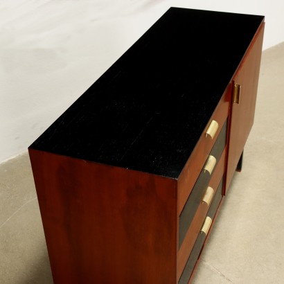 Buffet avec porte battante et tiroirs apparents en placage de teck naturel et noirci, pieds en métal émaillé et poignées en laiton. Restauré.
