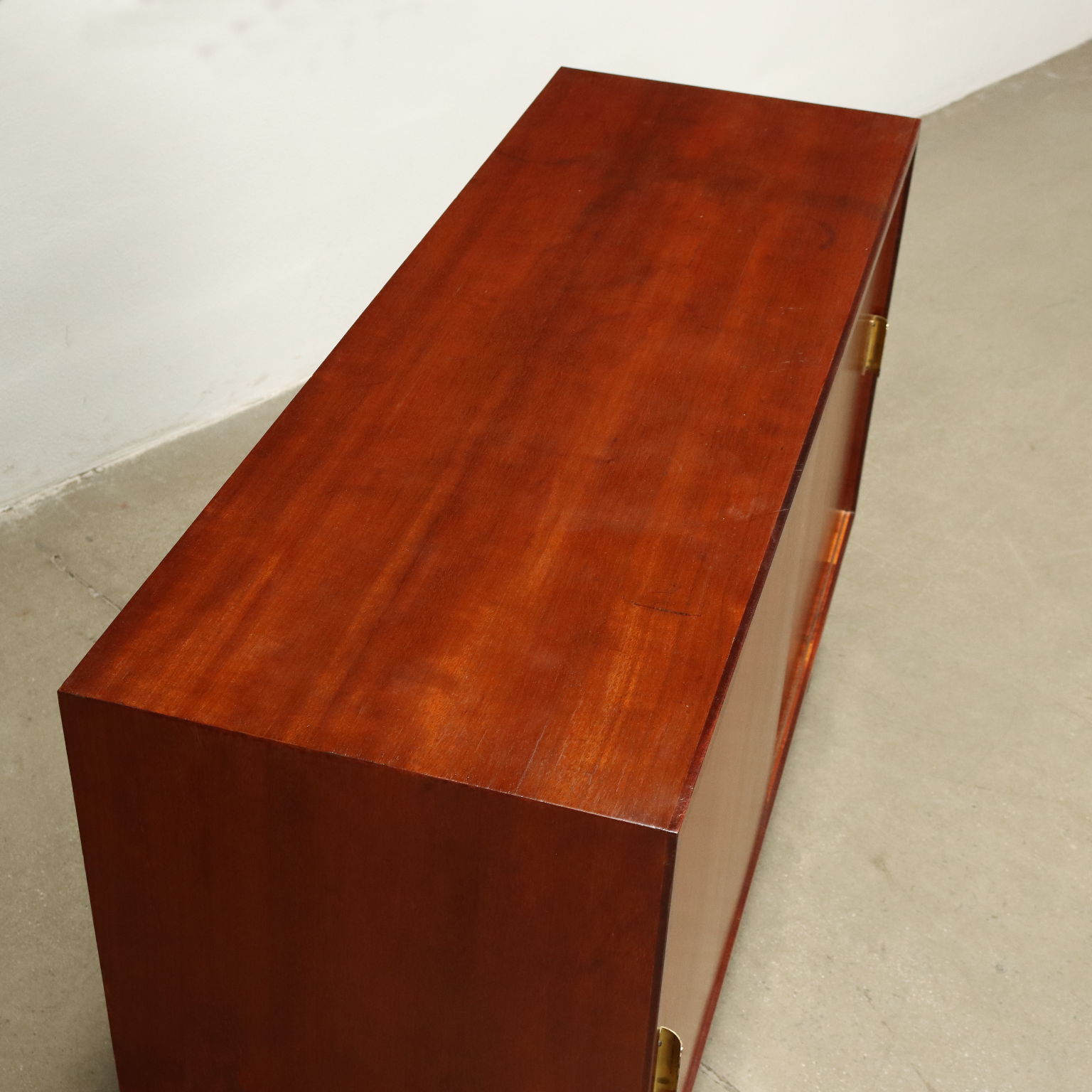 Buffet à portes coulissantes en placage de teck, pieds en métal émaillé et poignées en laiton. Restauré.