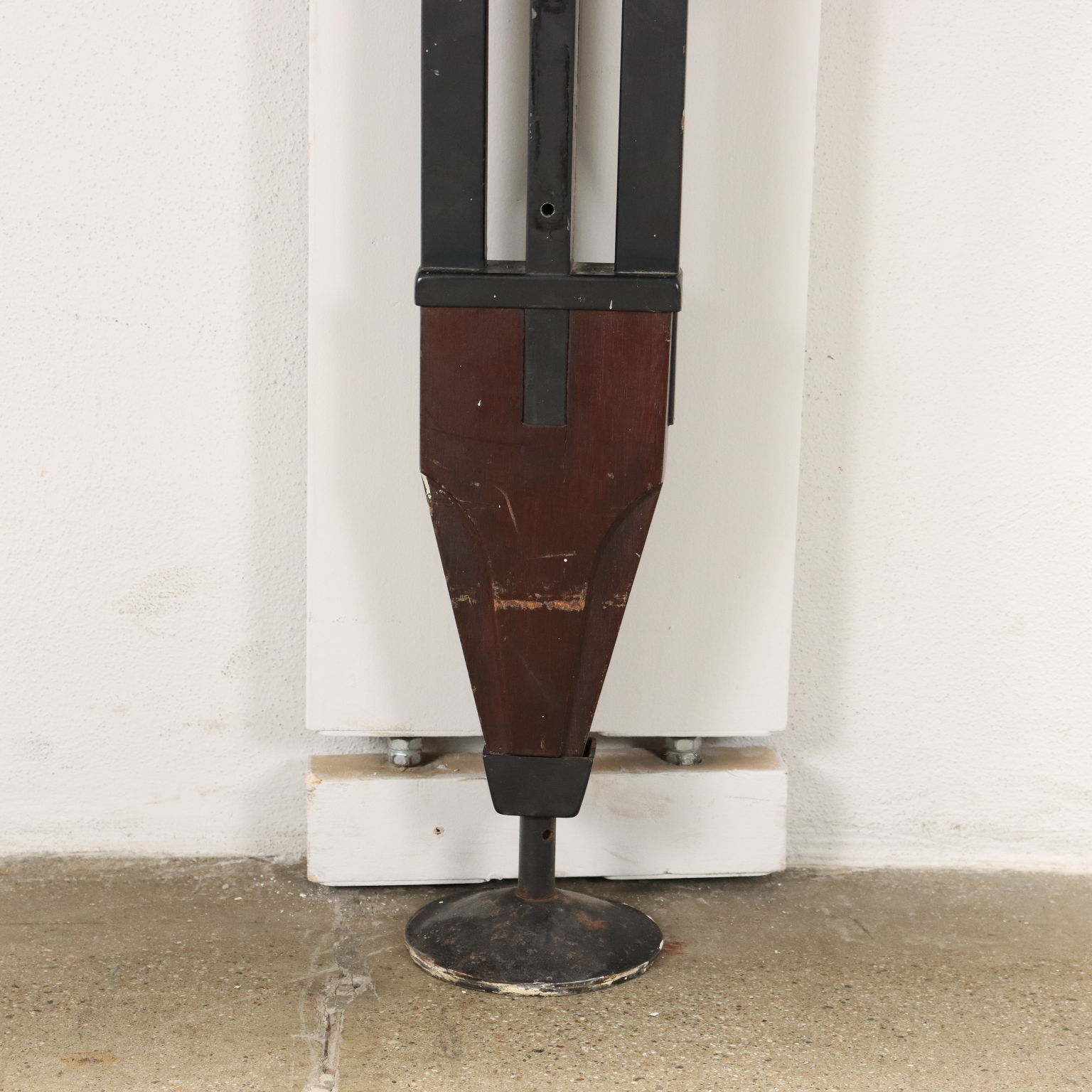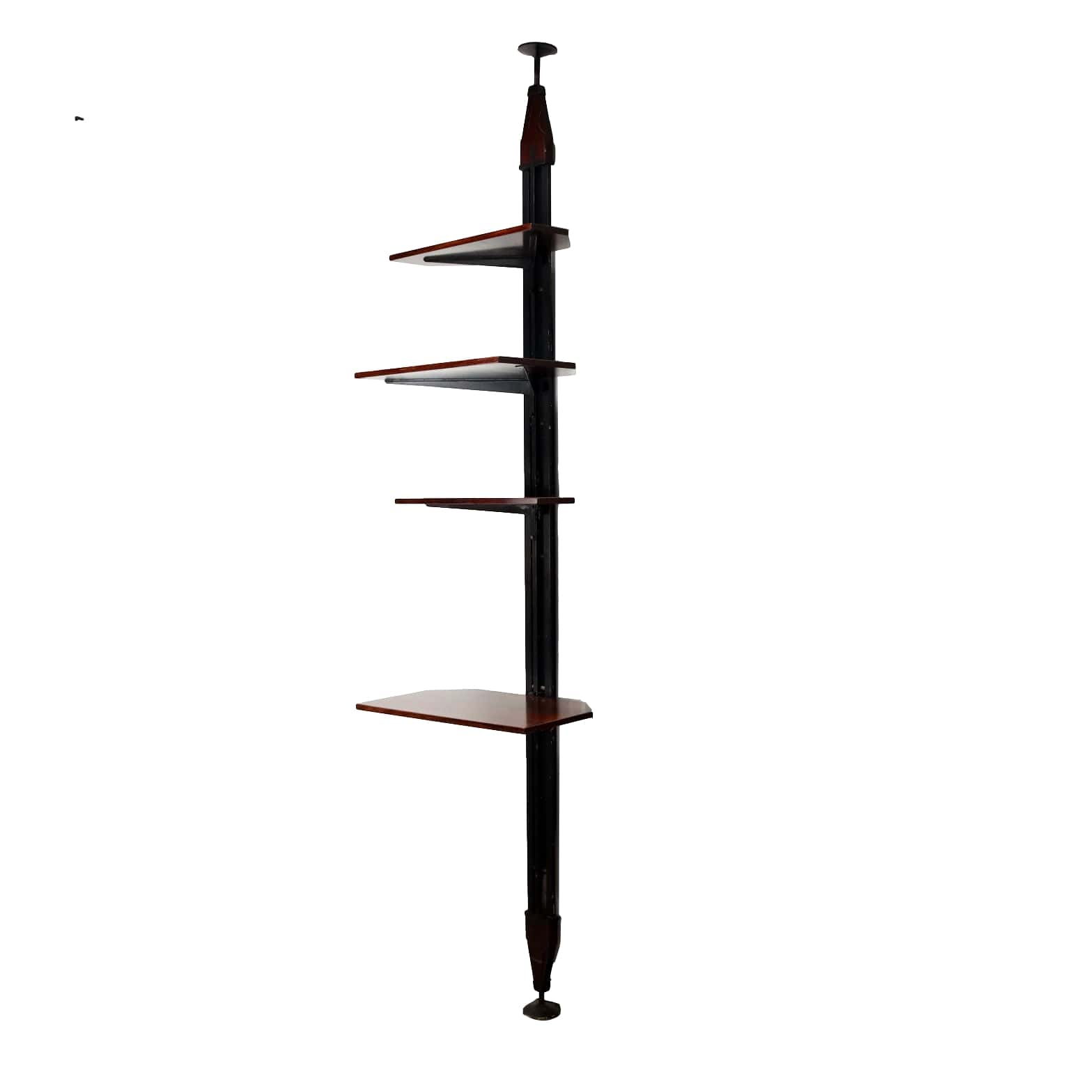 Bibliothèque de plafond dans le style de Paolo Tilche, dont le positionnement idéal est dans un coin, compte tenu de l'inclinaison des étagères. Placage de bois exotique, montant en métal émaillé.
