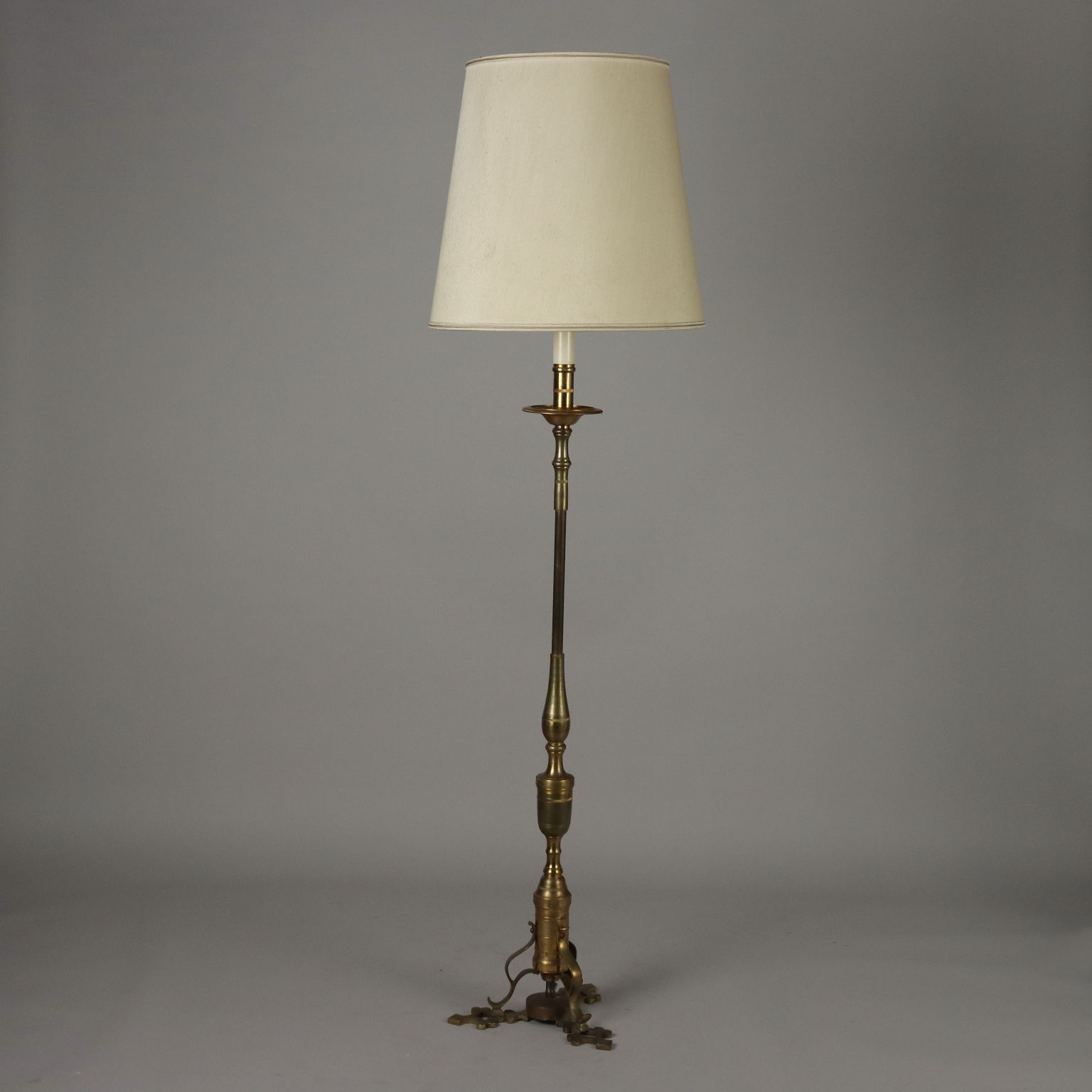 Lampadaire réalisé à partir d'un ancien bougeoir néo-gothique en laiton, modifié ultérieurement en hauteur avec un insert en bronze et réélectrifié. Abat-jour en tissu.