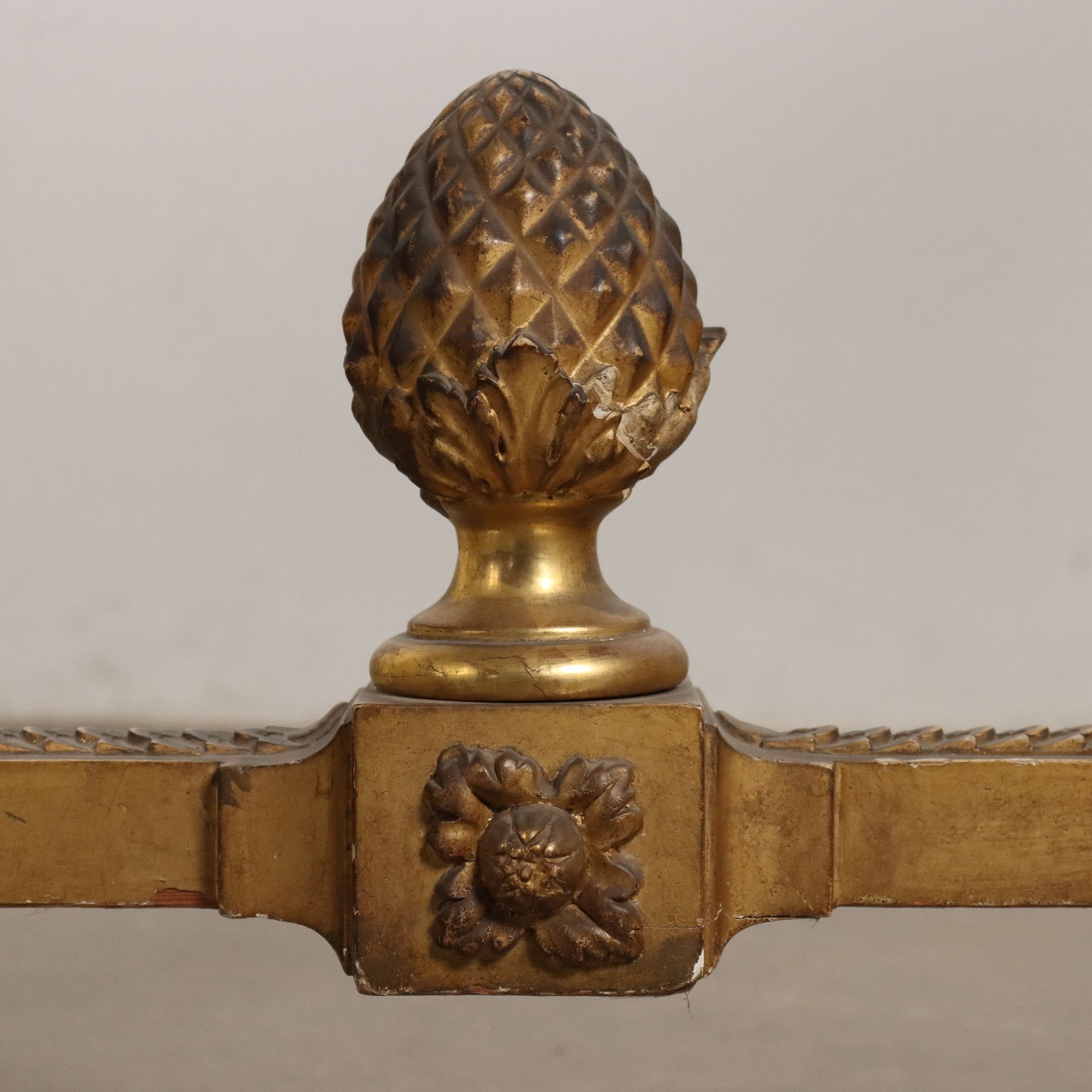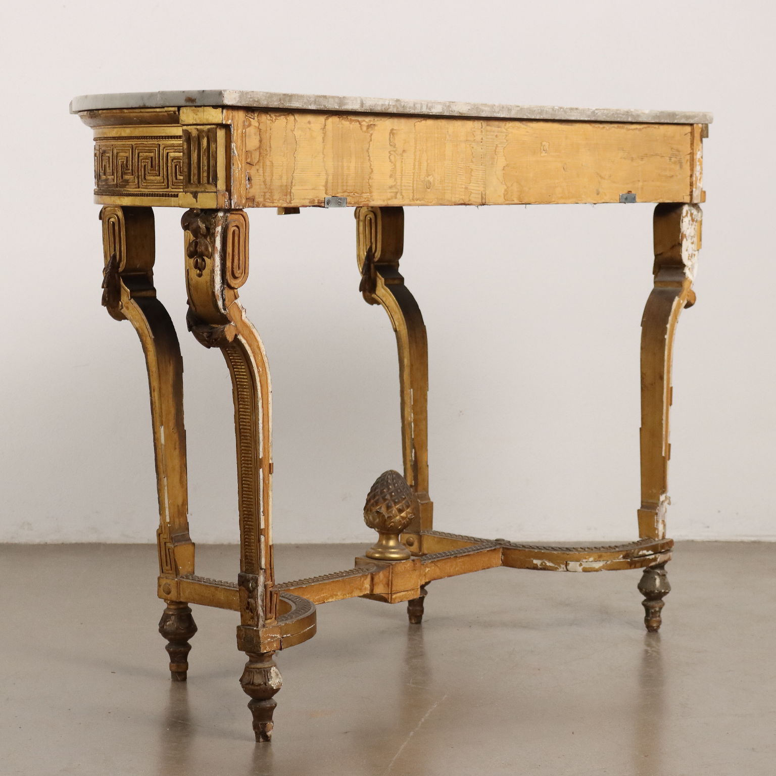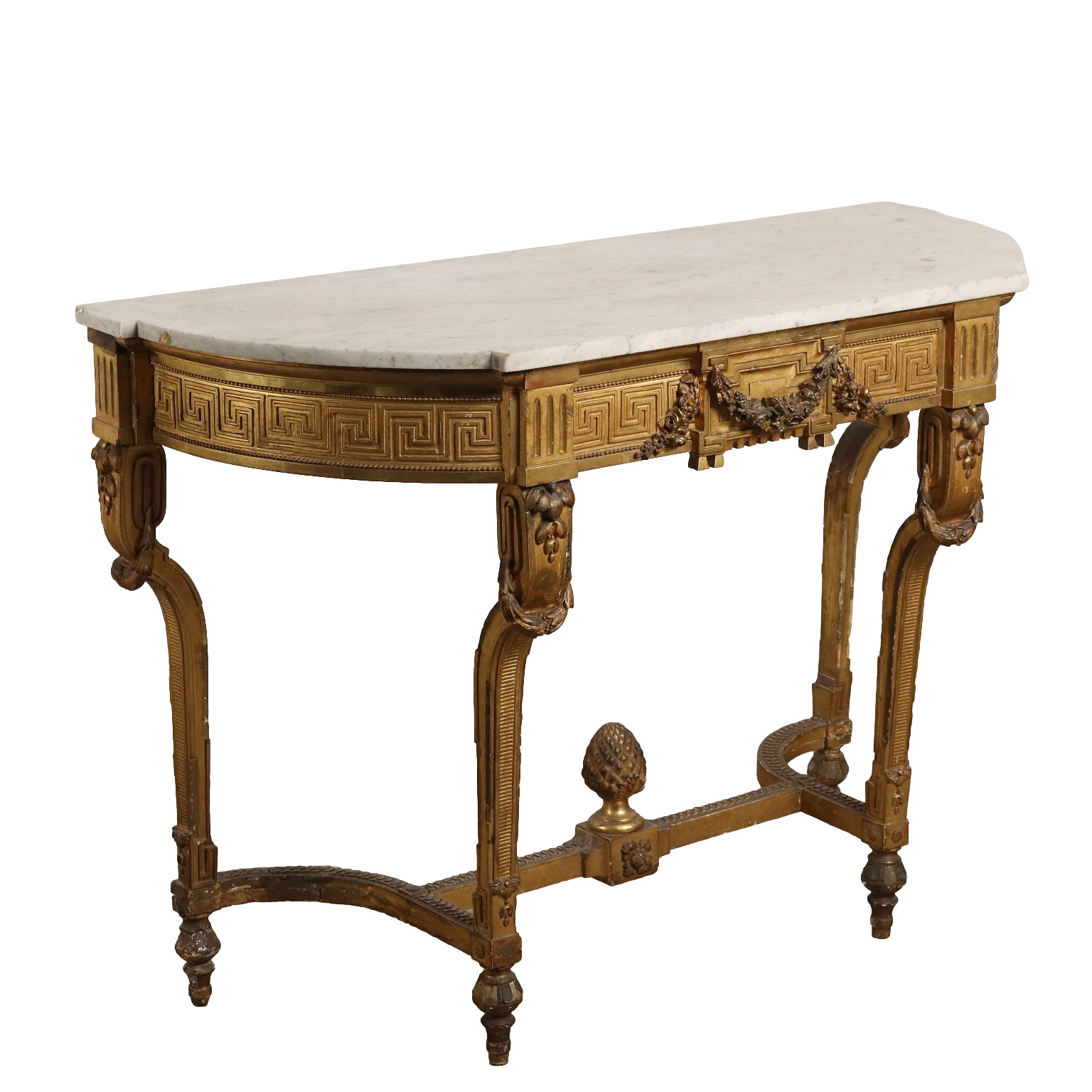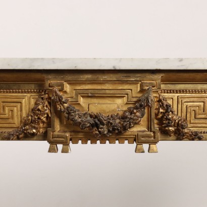 Console soutenue par des montants ondulés reliés par des traverses également ondulées et ornées d'une pomme de pin centrale ; il est sculpté de motifs grecs et de festons néoclassiques ; entièrement doré, le plateau profilé est en marbre blanc.