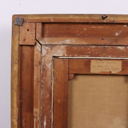 Peinture à l'huile sur toile. Signature et localisation Rome en bas à droite. Au dos du cadre se trouve une étiquette avec le nom de l'artiste et la mention "Chez J. Spiridon, Rue Pigalle, Paris". Une étiquette avec numéro d'inventaire est également présente sur le cadre. L'étiquette fait référence au collectionneur français Joseph Spiridon (1845 -1930), qui s'est consacré à poursuivre la collection d'œuvres d'art déjà commencée par son père Georges, en les achetant en Italie au cardinal Fesch, prélat en poste à Rome qui fut autrefois son un important collectionneur d’art. La localisation du tableau à Rome correspond à la longue période que l'artiste valencien Vicente March a passée dans la capitale, où il était arrivé encore jeune pour parfaire sa formation artistique. March se distingue notamment par ses peintures de sujets folkloriques et de scènes de genre, adepte du costumbrismo, le mouvement artistique et littéraire espagnol qui s'inspire des costumes et des scènes de la vie populaire. Ses œuvres connaissent un succès généralisé dans toute l'Europe et se retrouvent dans de nombreuses collections privées. Dans ce tableau, de belle qualité, March propose une scène d'intérieur dans un décor patricien, avec deux jeunes filles en robes du XVIIIe siècle qui s'amusent à jouer du luth, l'une et l'autre chantant ; les deux personnages sont placés près d'une haute fenêtre ouvragée d'une riche salle, aux murs ornés de fresques et meublées de tapisseries, avec des meubles marquetés et un fin tissu damassé sur la table. La capacité de rendu pictural des détails et des détails est notable. Le tableau est présenté dans un cadre contemporain de la fin du 19ème siècle.