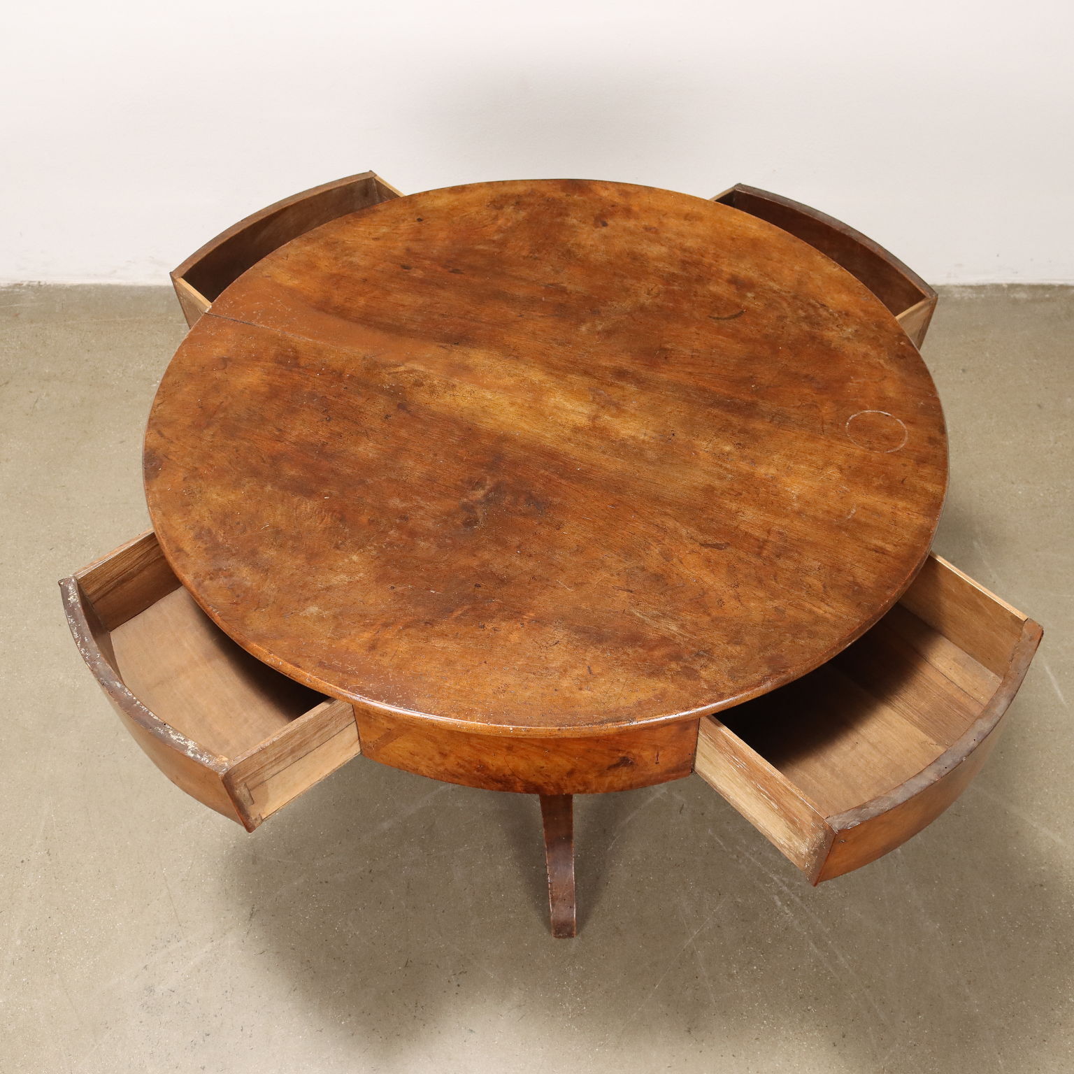Table Louis Philippe soutenue par un balustre central tourné reposant sur trois pieds ondulés, présente quatre tiroirs dans le bandeau, plateau circulaire ; en noyer.