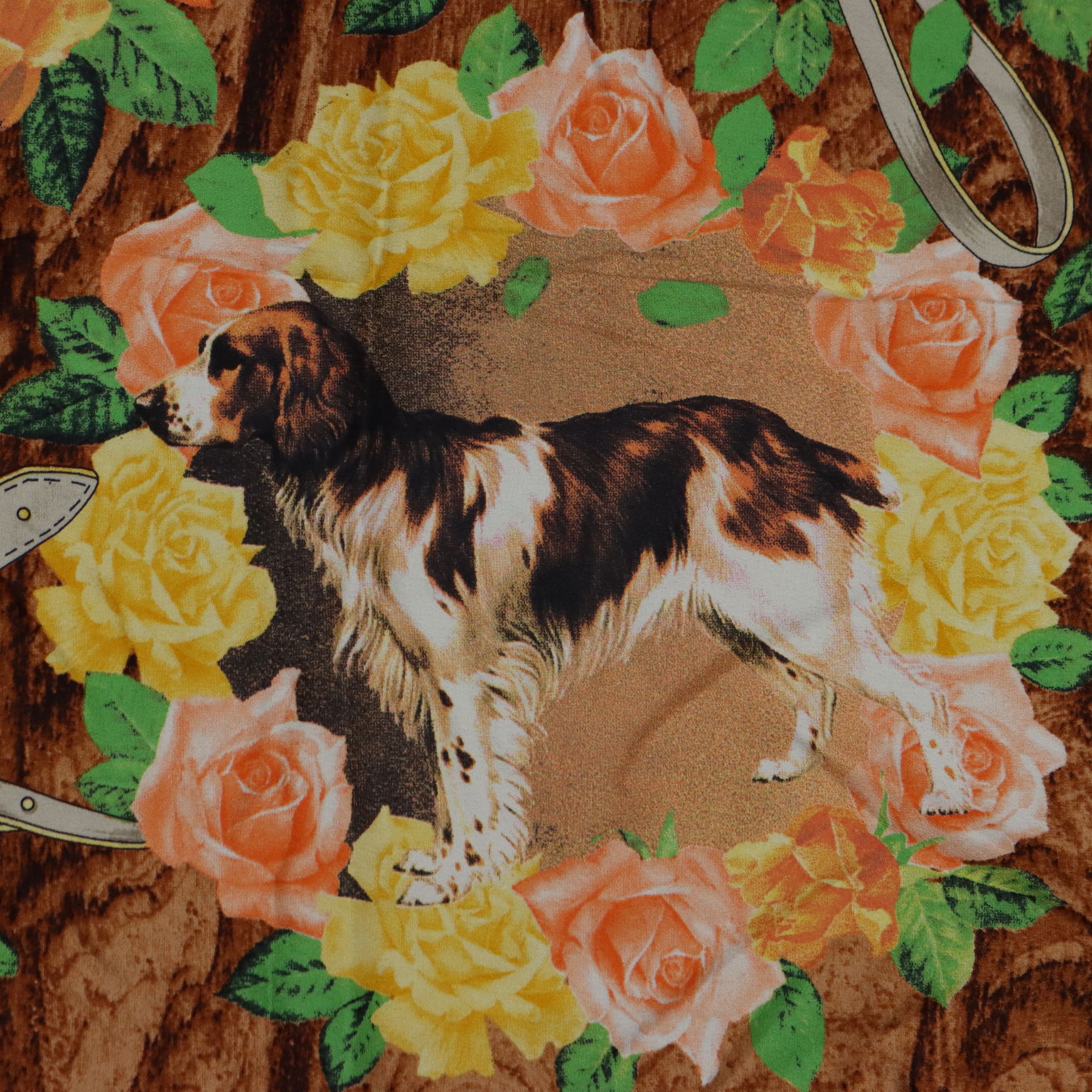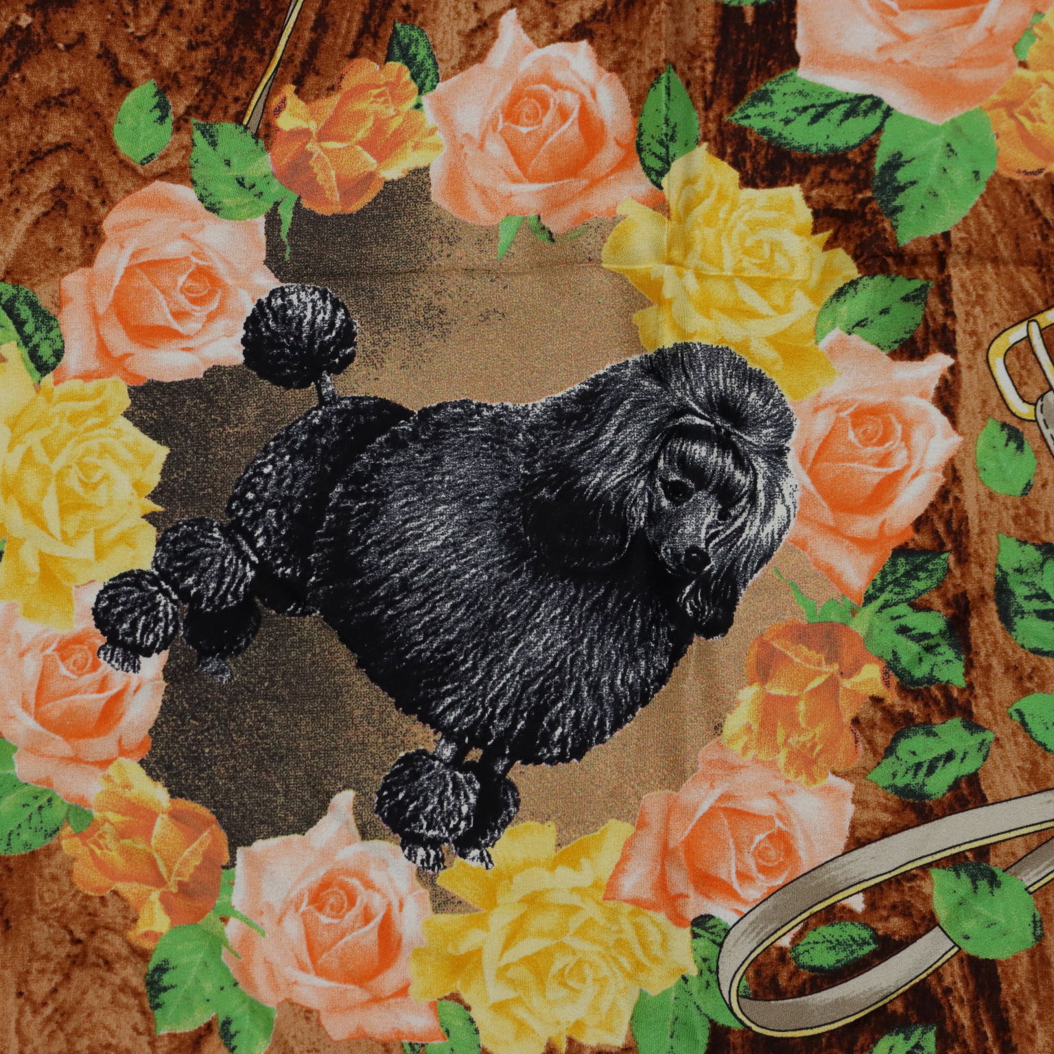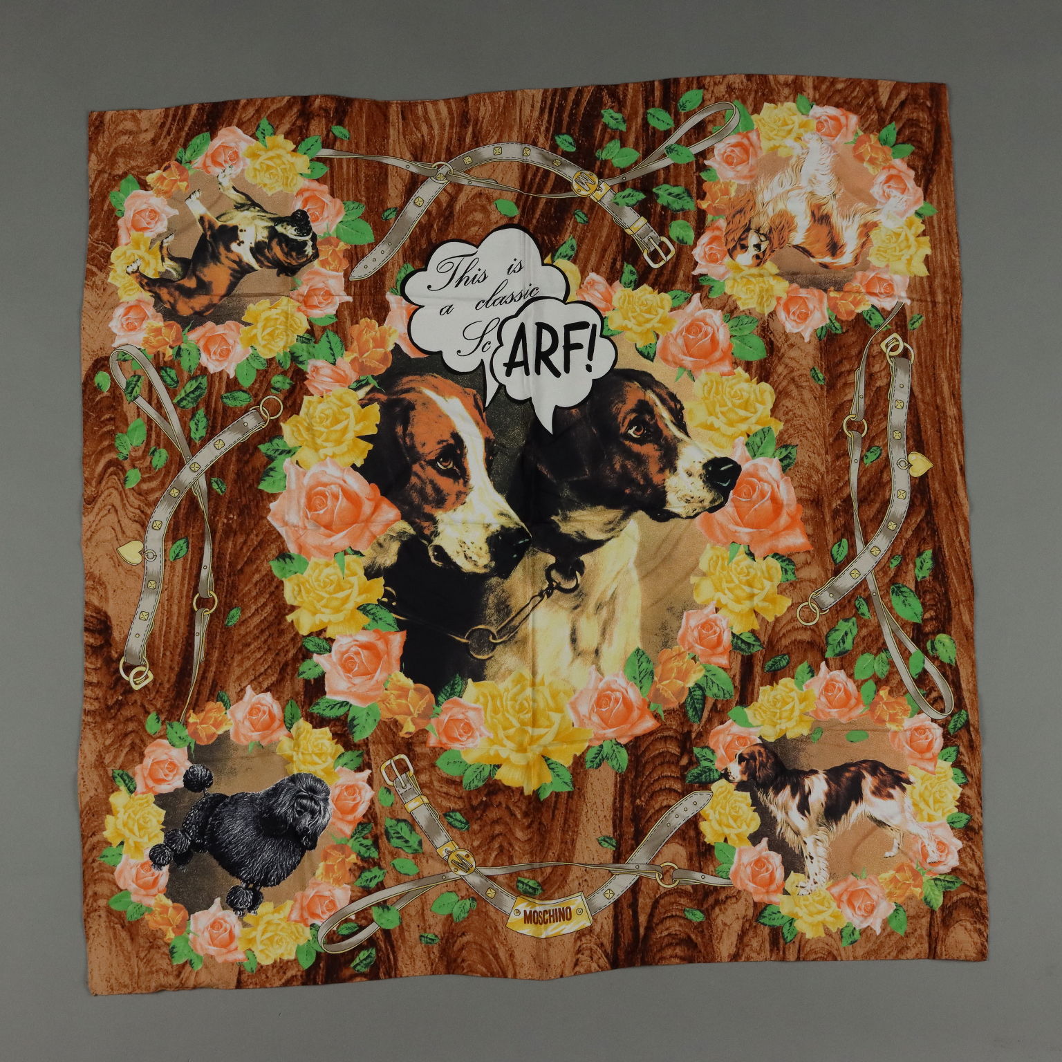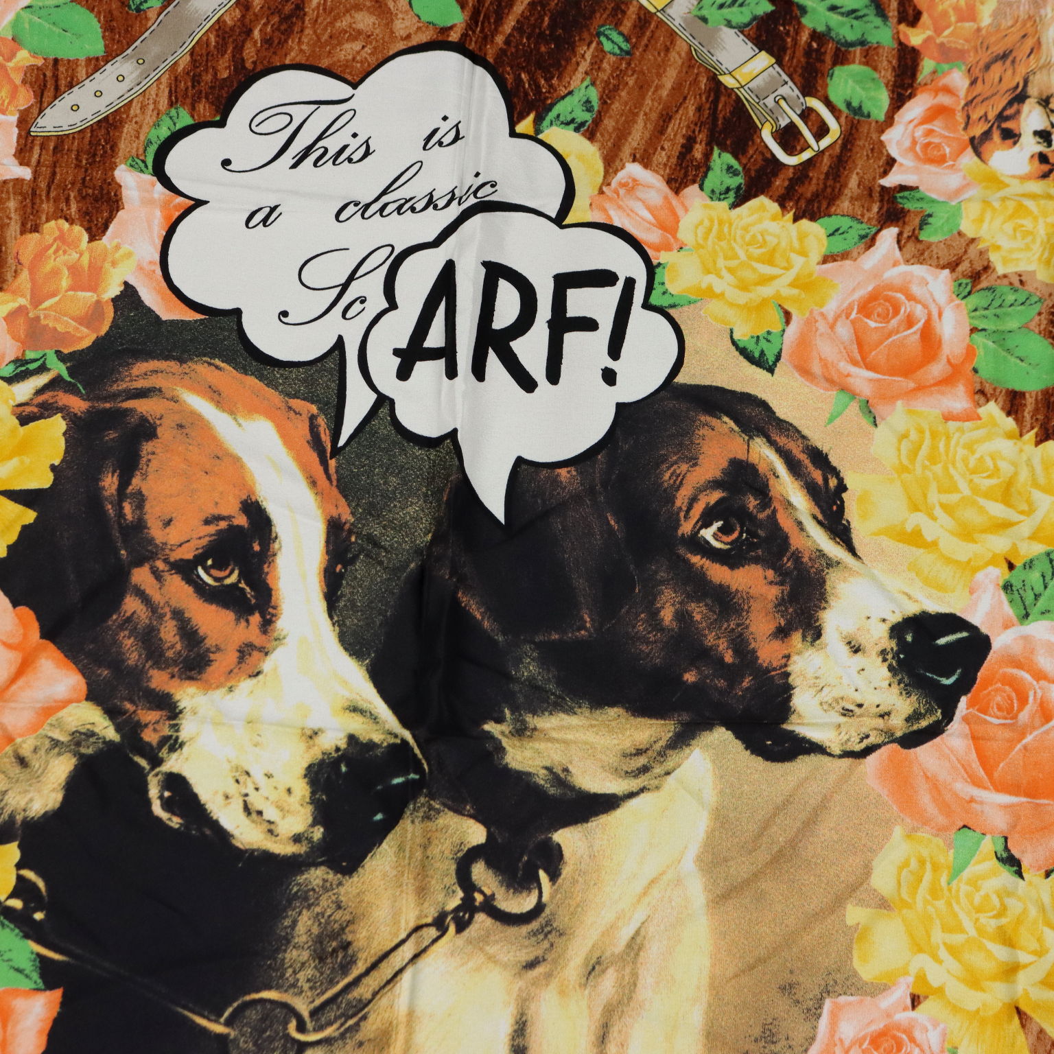Foulard en pure soie, avec un imprimé original représentant des chiens, entouré de cadres de roses et une bande dessinée de style pop art qui dit avec un jeu de mots "This is a classic scARF!".
