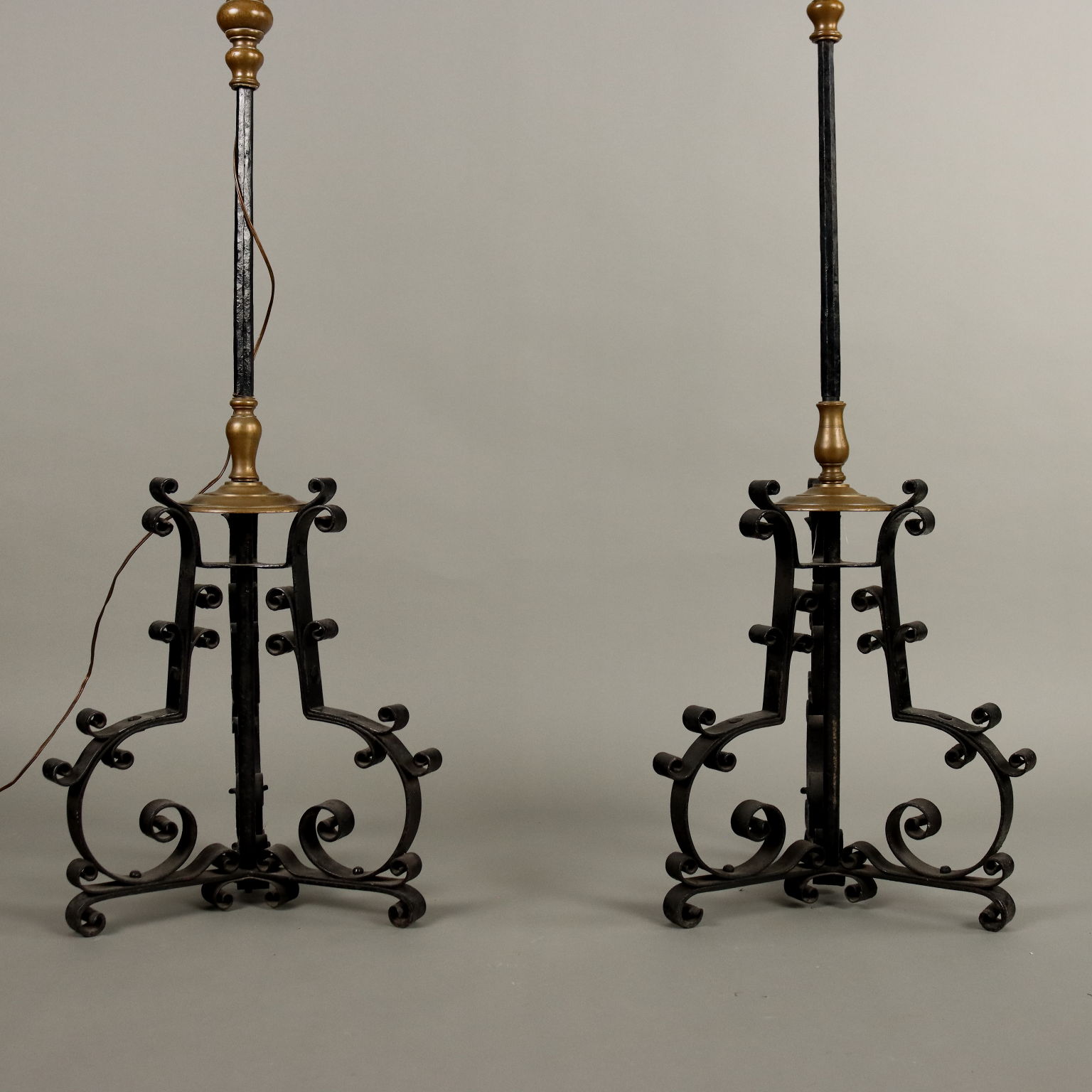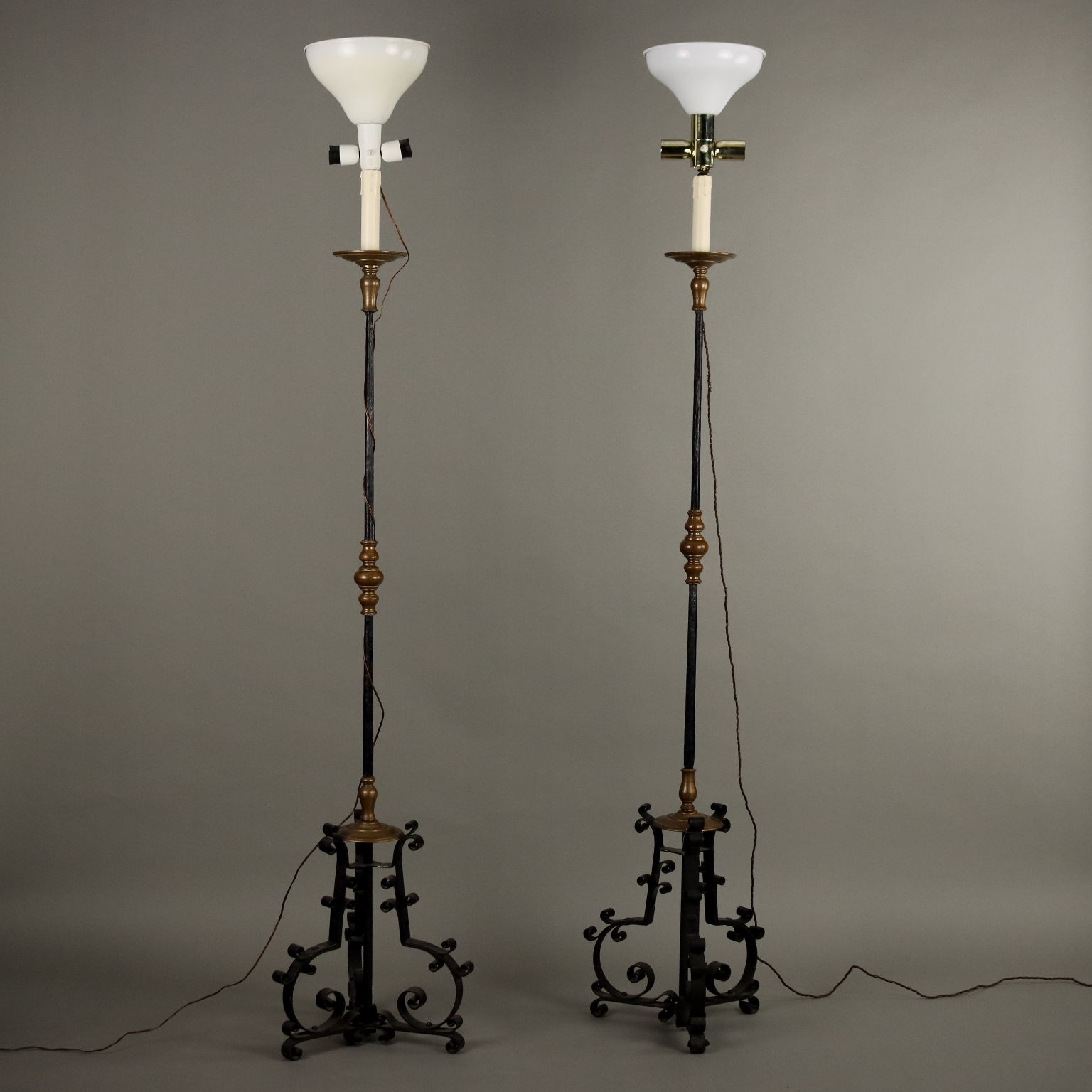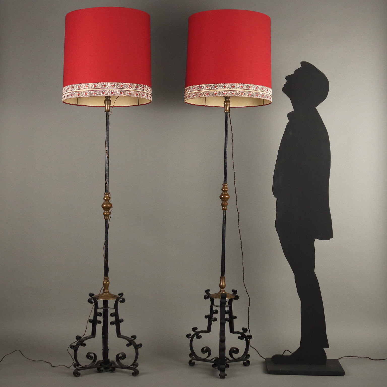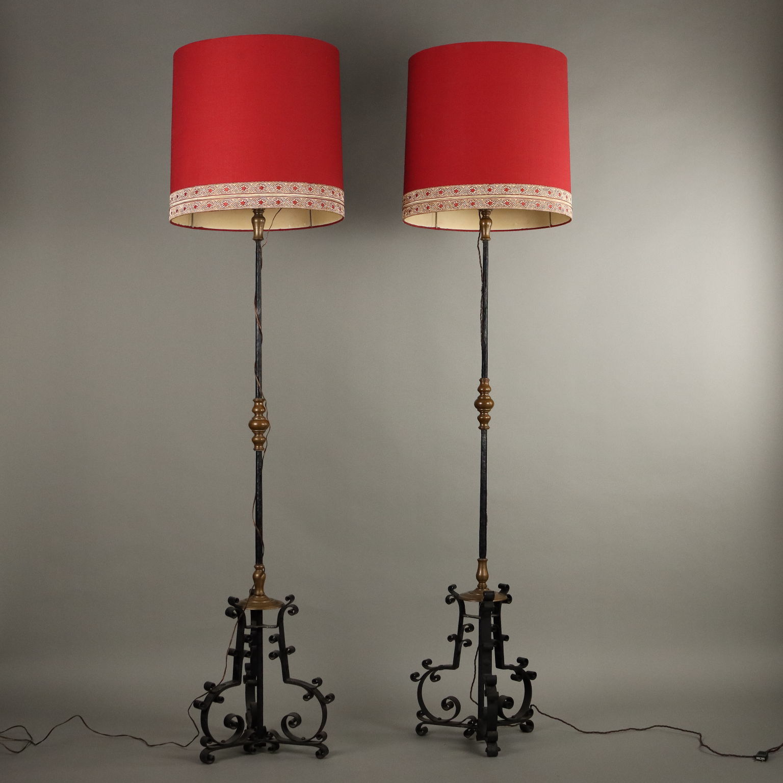 Paire de porte-torches en fer forgé peint, reposant sur un piètement tripode, présentent des inserts en bronze doré. Abat-jour en tissu et broderie bordeaux. Italie, fin du XIXe siècle.