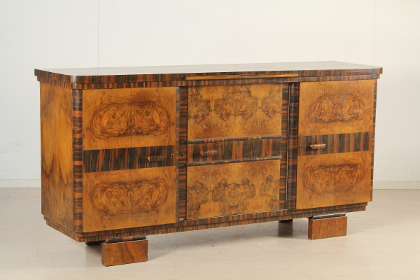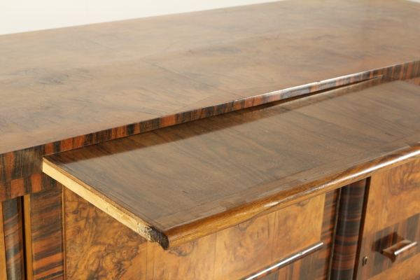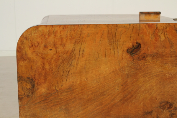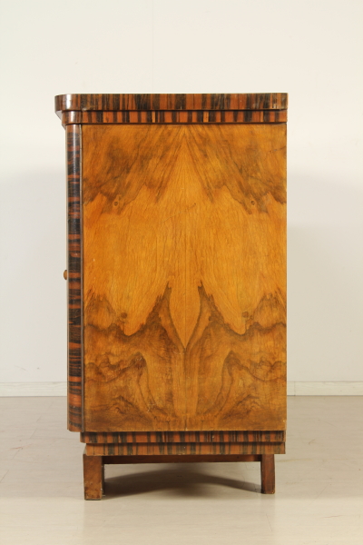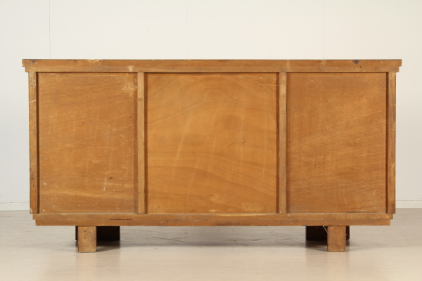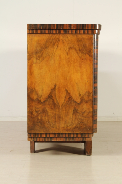 3 porte commode ; Bois plaqué noyer. Bon état, montre peu de signes d'usure.