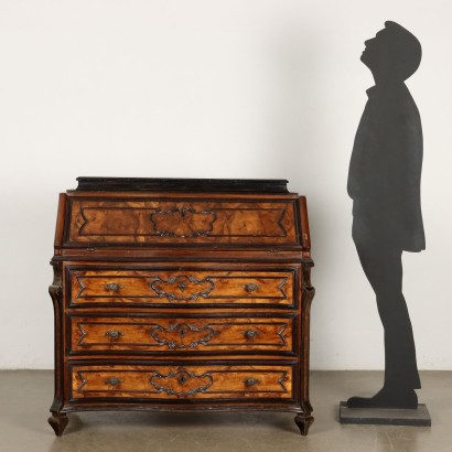 Abattant de style baroque lombard en noyer et racine de noyer, réalisé avec des pièces en bois antiques, Italie, début du XXe siècle. Façade ondulée avec support équipé d'une paire de tiroirs latéraux, d'un meuble dissimulant à porte pliante, de trois tiroirs, de pilastres verticaux et de pieds à quarante-cinq degrés. Décoré de sculptures de style rocaille et de cadres noircis.