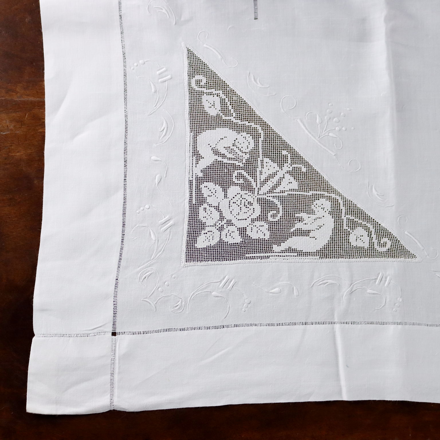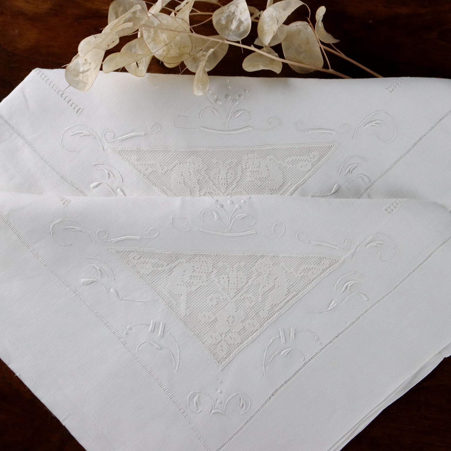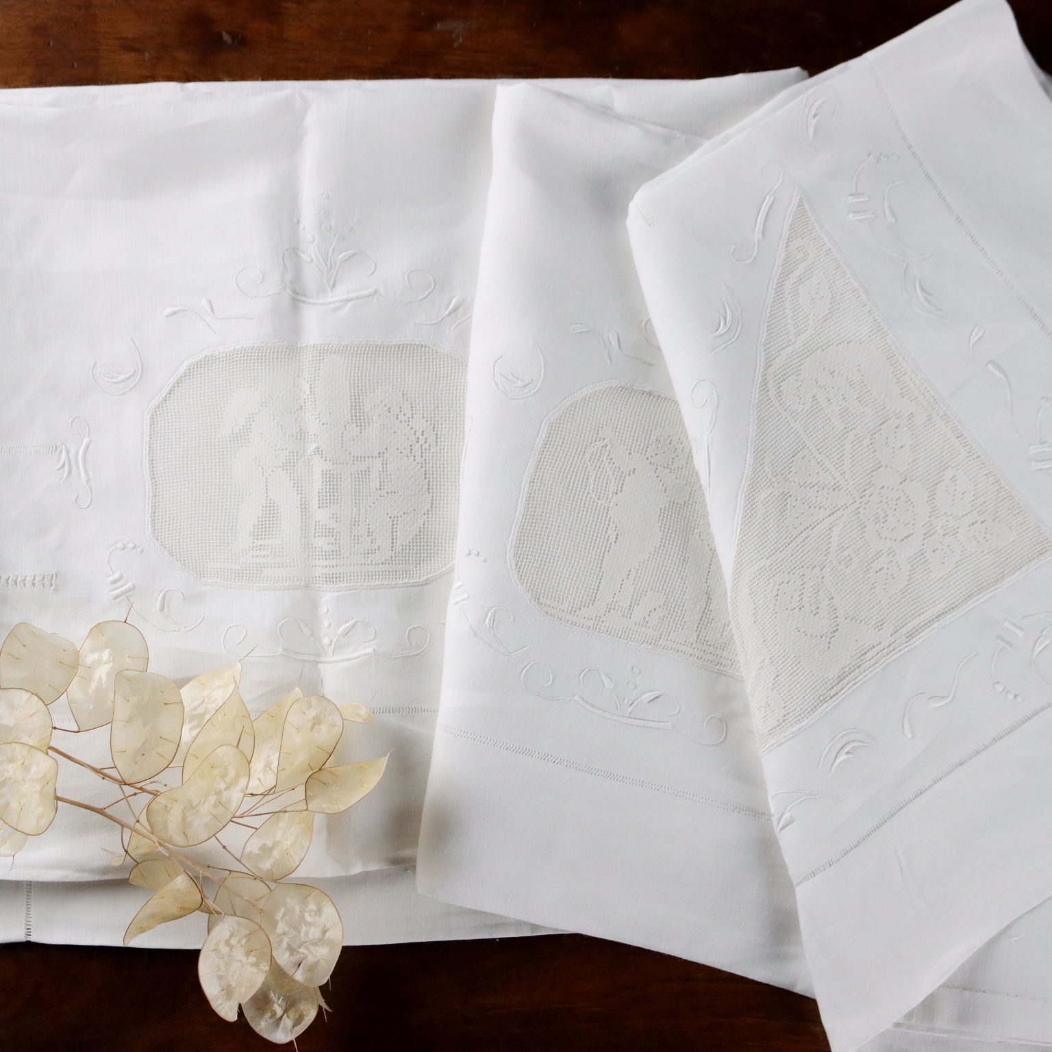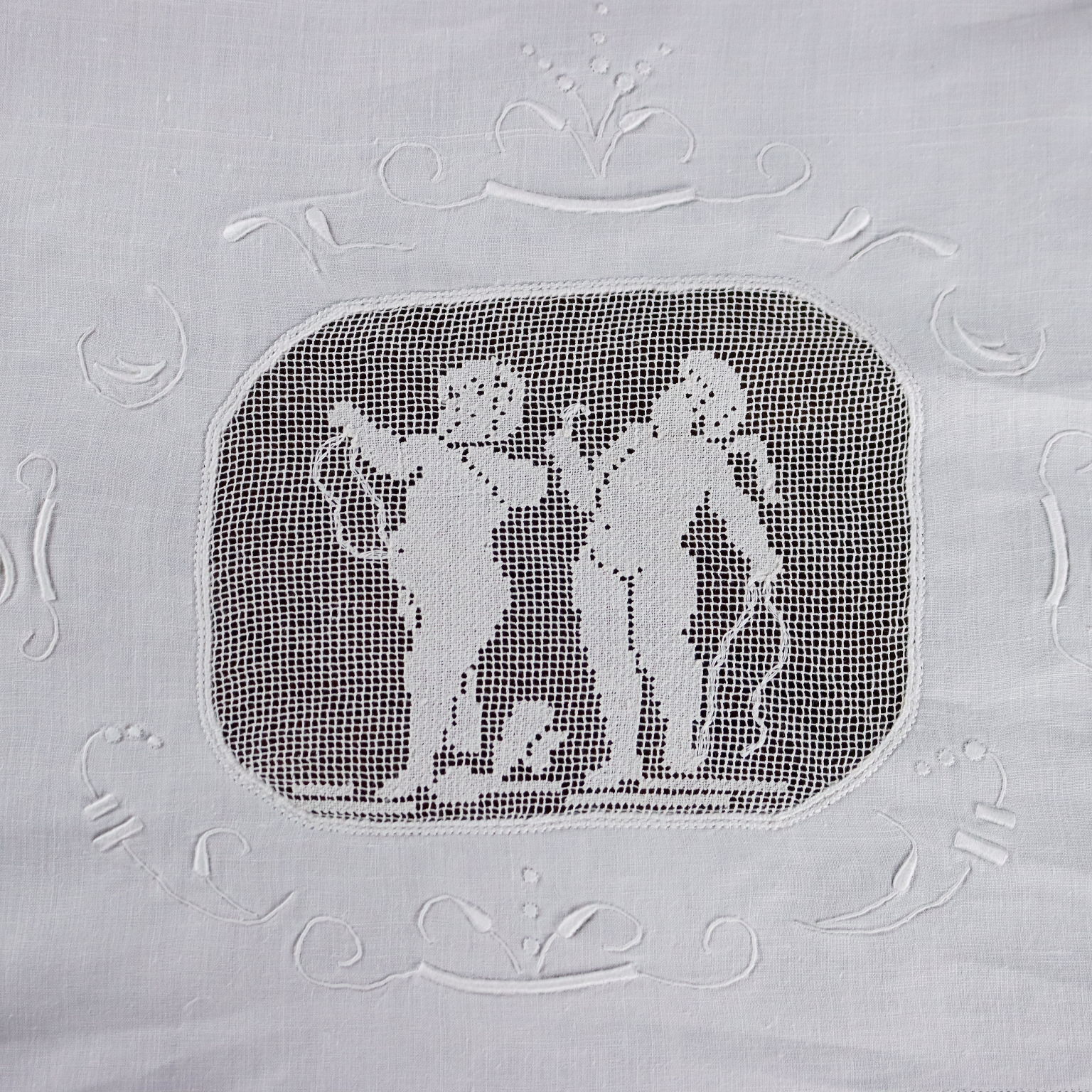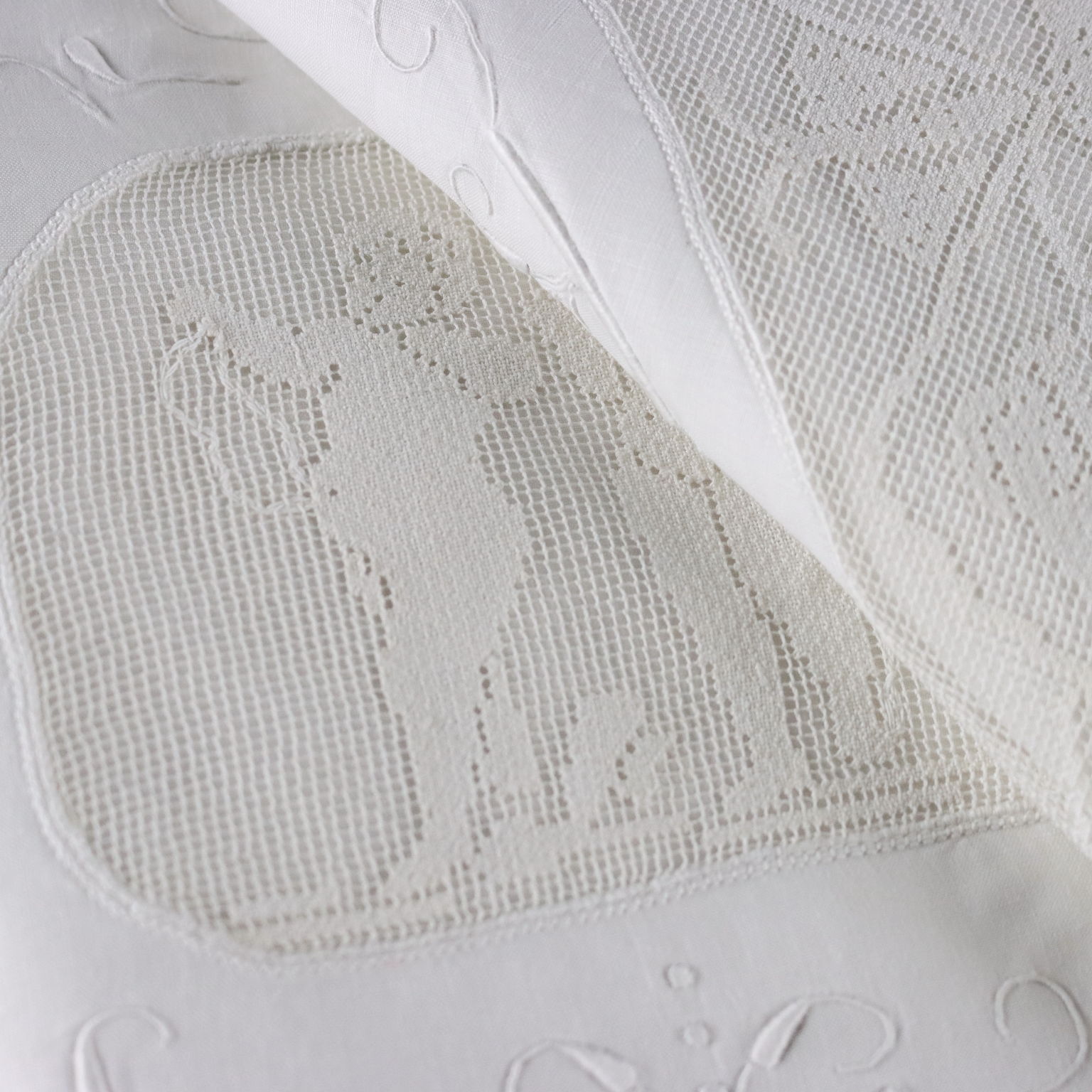 Drap double et paire de taies d'oreiller Revers fabuleux et raffiné avec de belles broderies et inserts en filet et représentation d'amours Légères marques du temps Couleur blanc Composition en lin Dimensions 288 cm x 266 cm