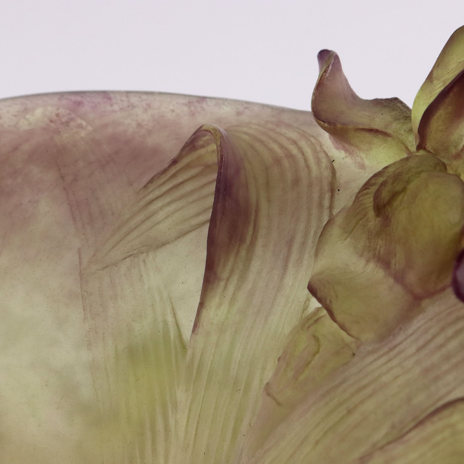 Centre de table en pâte de verre opalescente dans les tons jaune et lilas. Marque de fabrication gravée sur la base.
