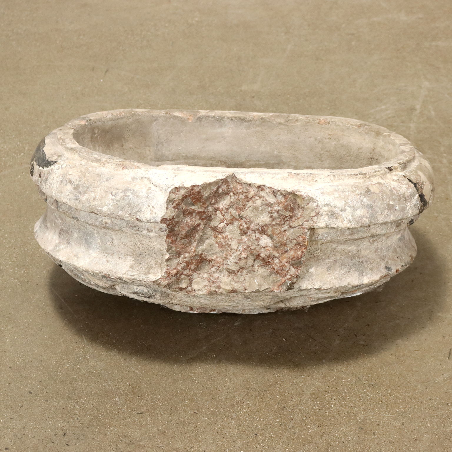 Vasque en marbre d'Arzo, réalisée avec une sculpture en forme de gousse et un moulage sur le bord de la vasque, selon un goût néo-Renaissance typique de la période éclectique de la seconde moitié du XIXe siècle.
