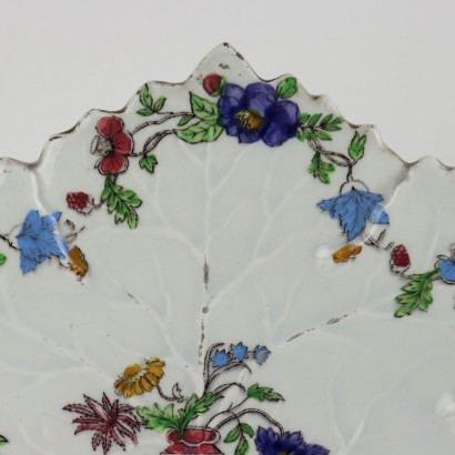 Assiette en faïence de forme feuille à bord dentelé et décors polychromes. Marque de fabrication gravée au revers.
