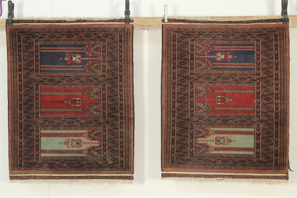 Paire de tapis de la moitié du ' 900. Matière : coton et laine. Type de nœud : fine. Manuel de fabrication.