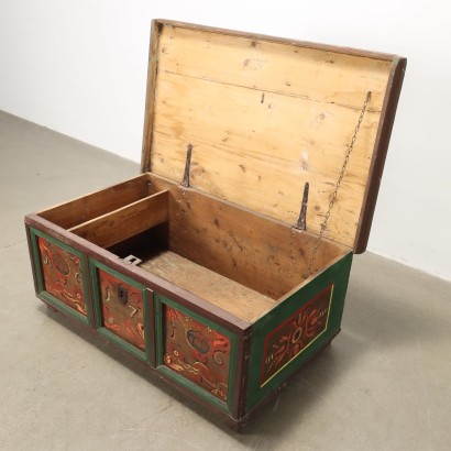 Petit coffre en sapin, façade tripartite. Laqué et peint à l'antique. Italie, XXe siècle.
