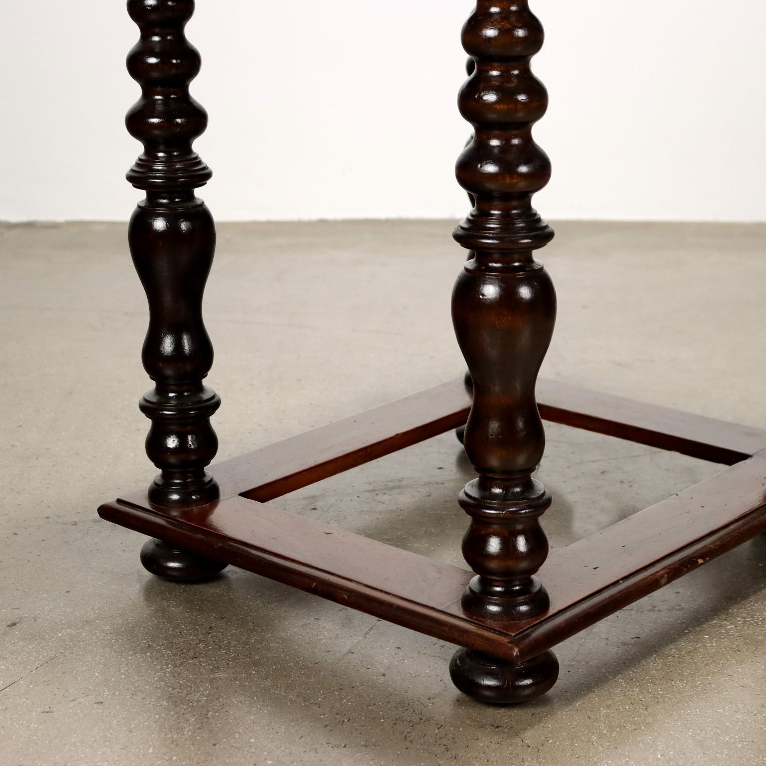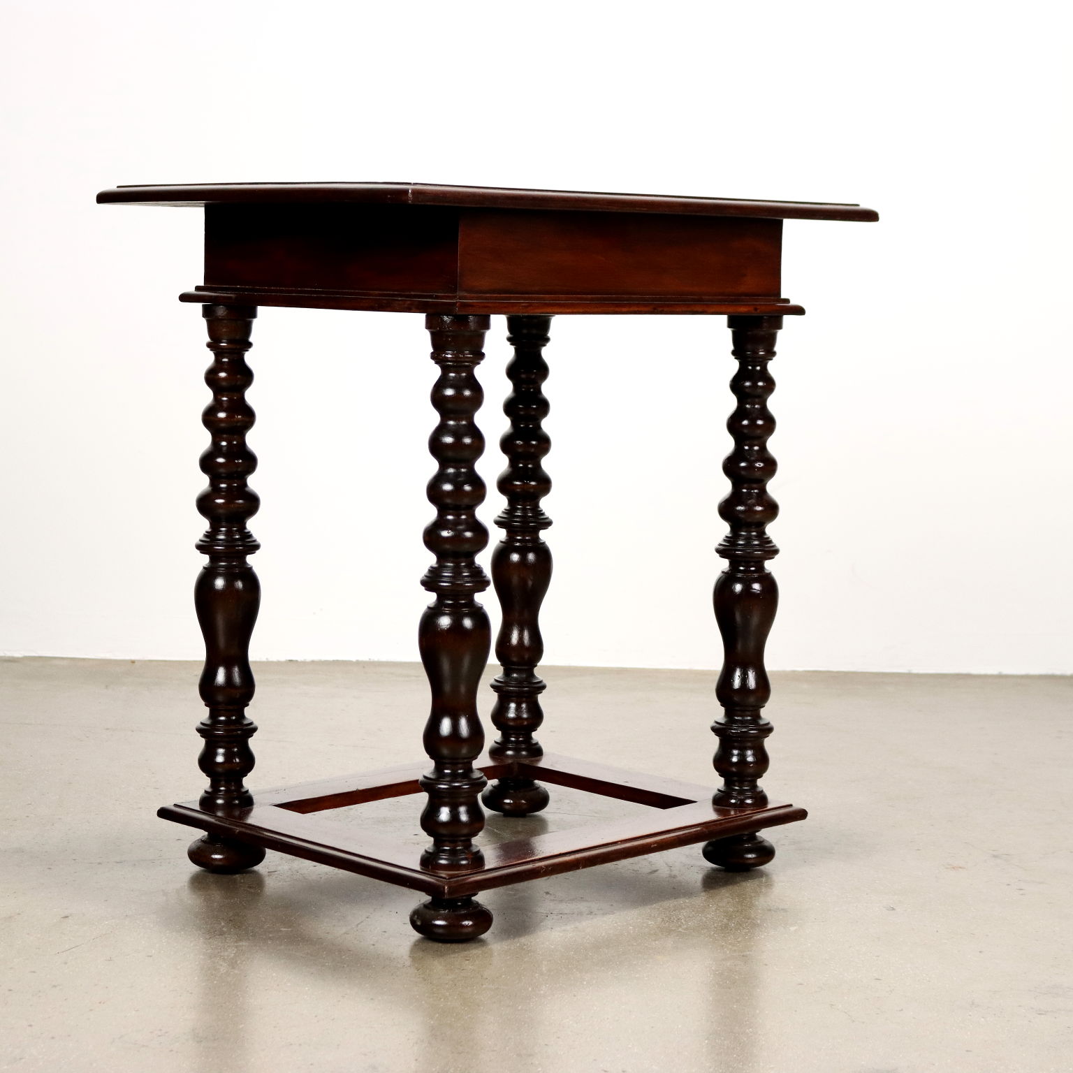 Table basse de style baroque en noyer, tiroir dans la bande inférieure, pieds et pieds tournés. Intérieur en sapin. Italie, fin du XIXe siècle.