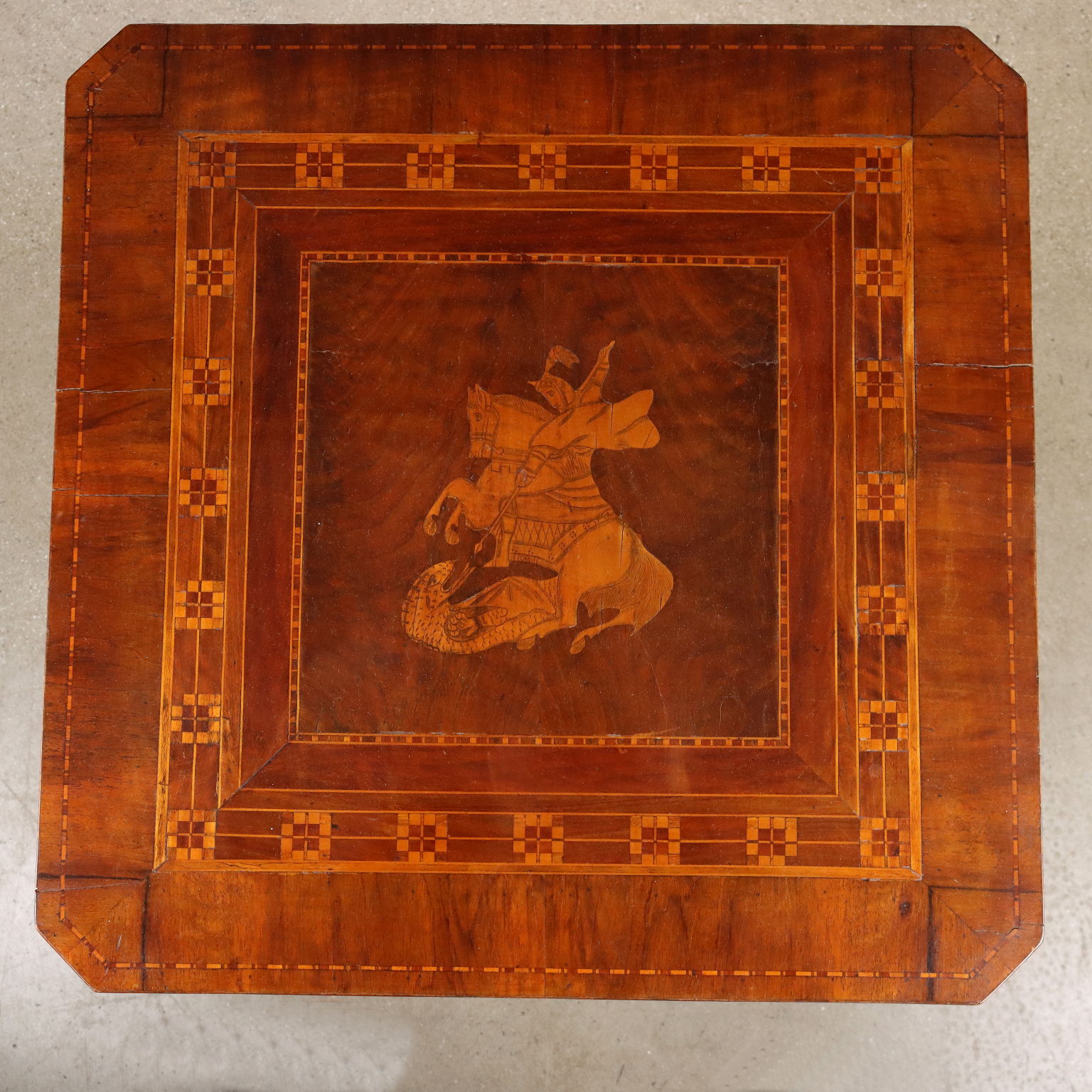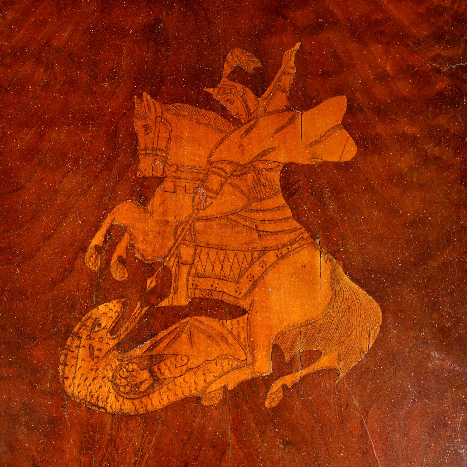 Table basse en noyer, plateau plaqué en noyer et plume de noyer, marqueterie centrale représentant Saint-Georges et filets d'érable. Pied central tourné et marqueté, soutenu par trois pieds ondulés. Emilia, XIXe siècle.