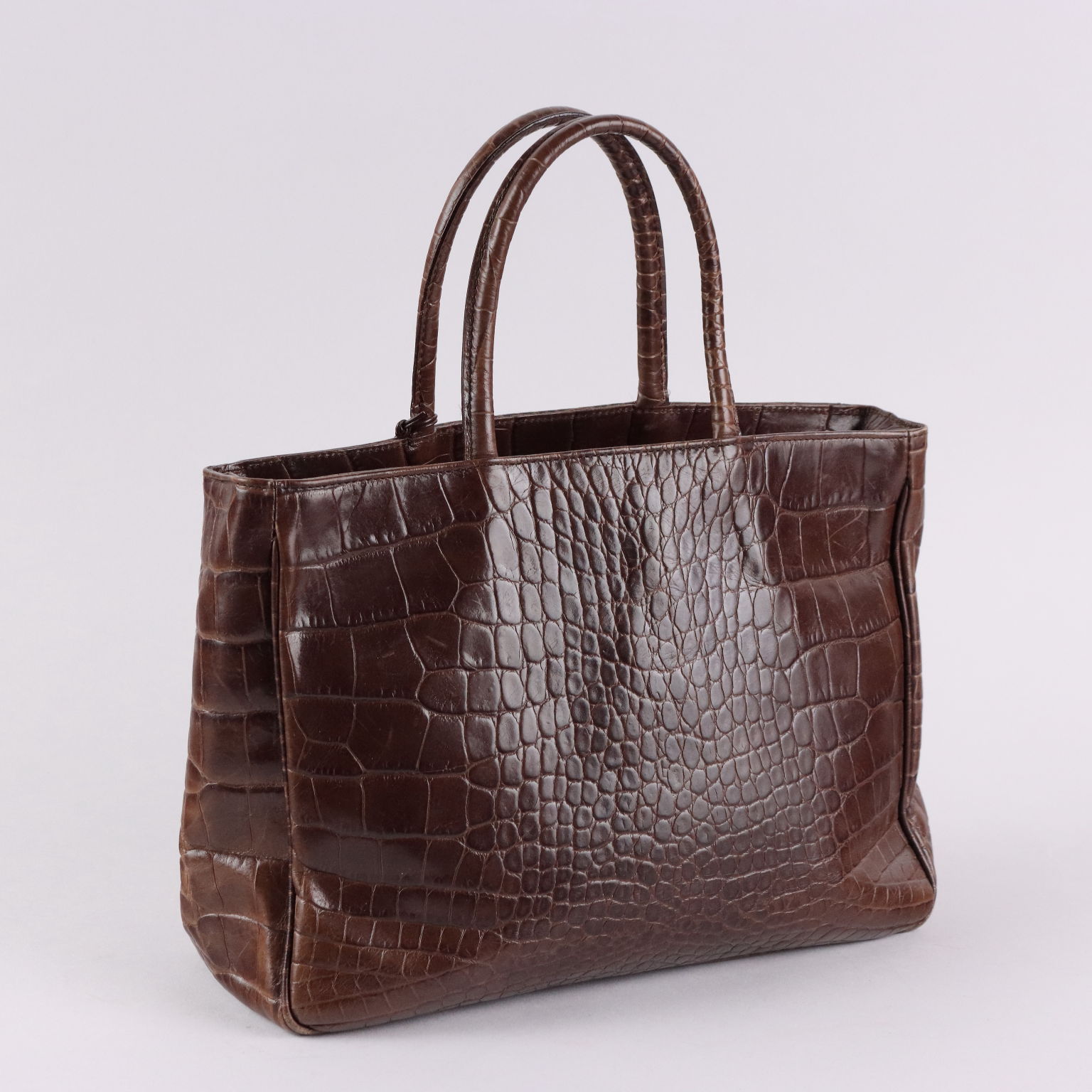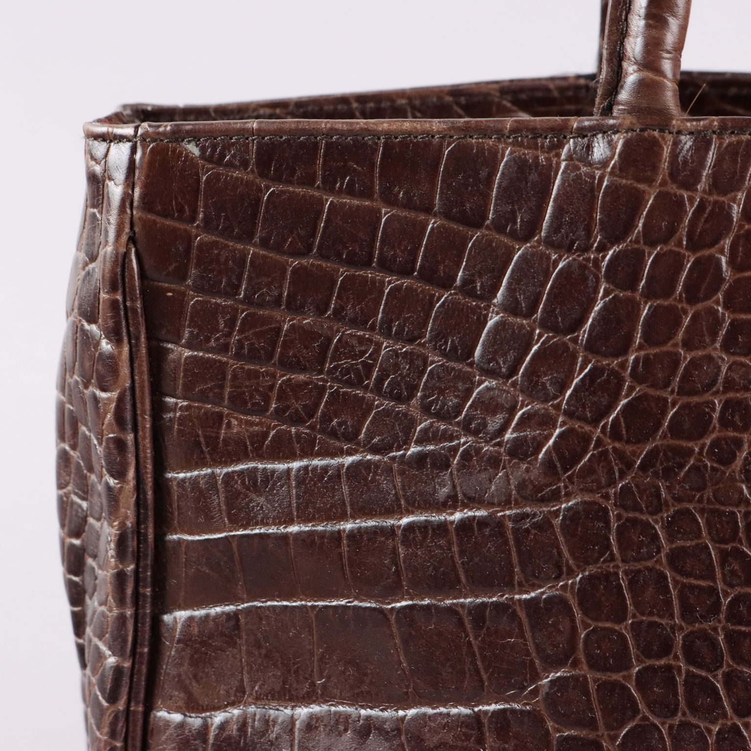 Sac à main en cuir imprimé crocodile marron. L'intérieur est doublé et organisé en deux compartiments et comporte deux poches zippées. L'article est en très bon état, avec de très légères traces d'utilisation sur le cuir. Bandoulière manquante.