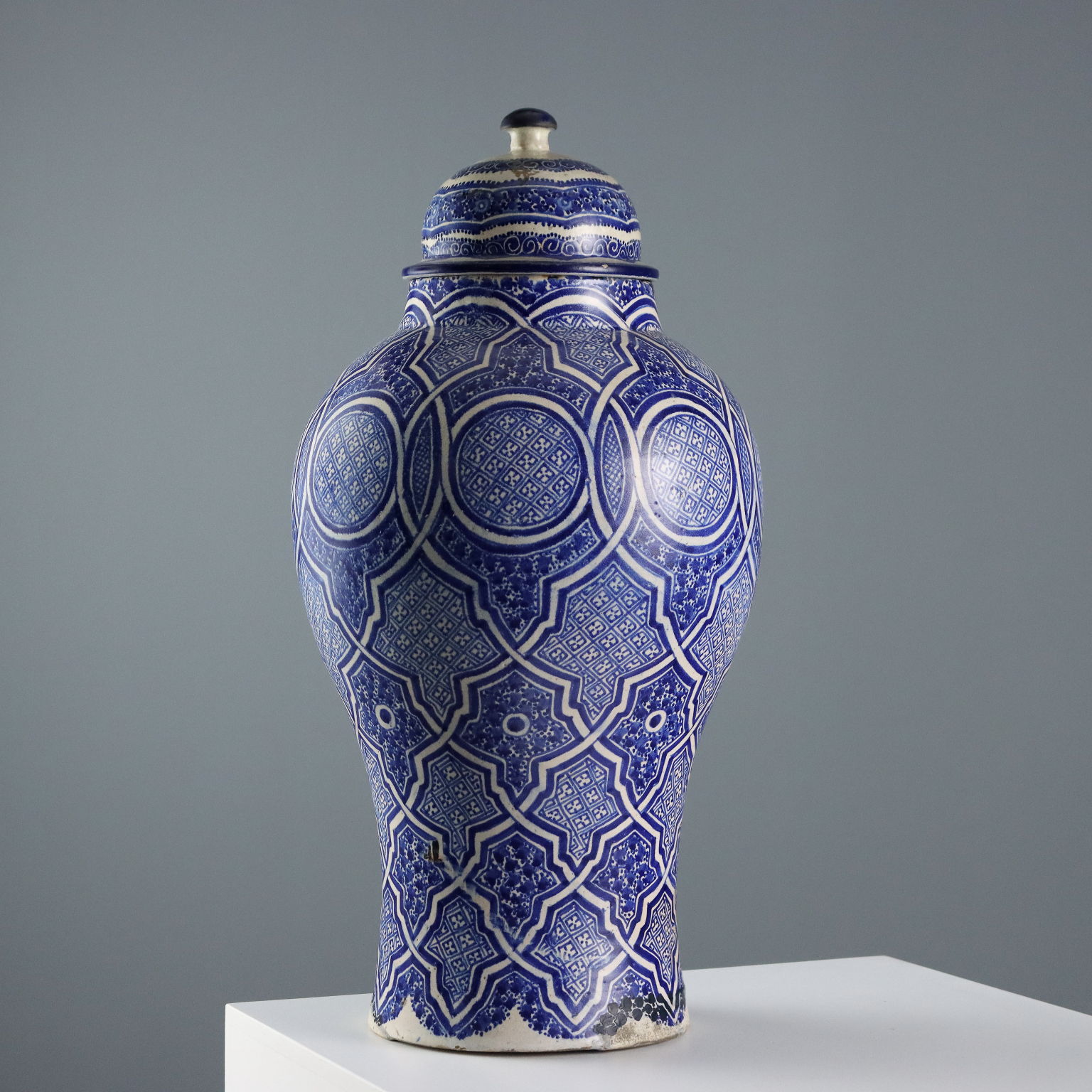 Vase en céramique majolique à décor géométrique dans les tons bleus.