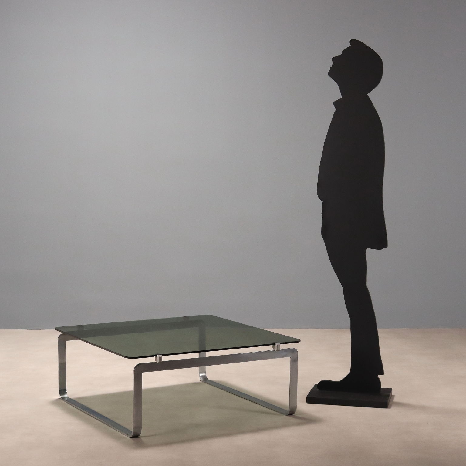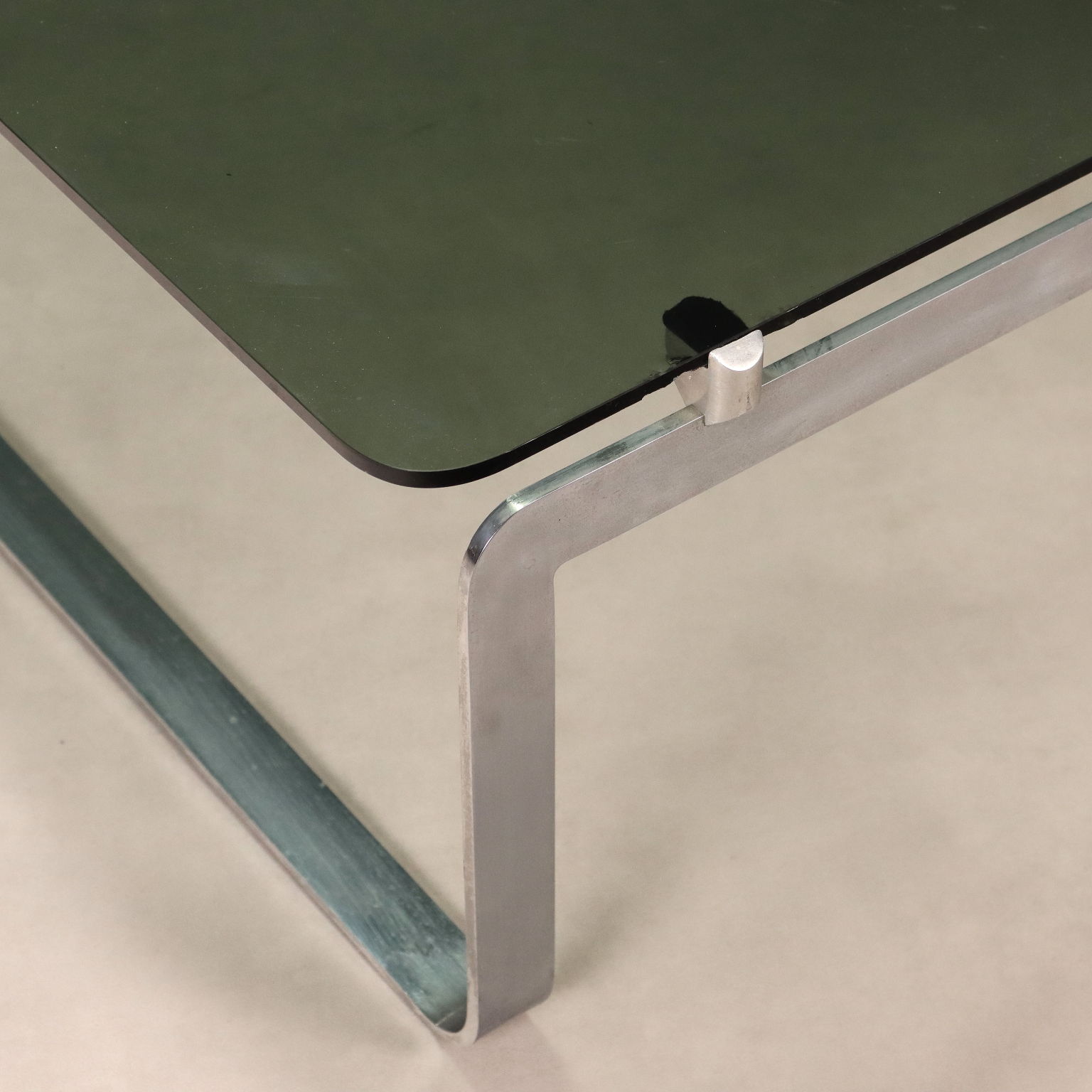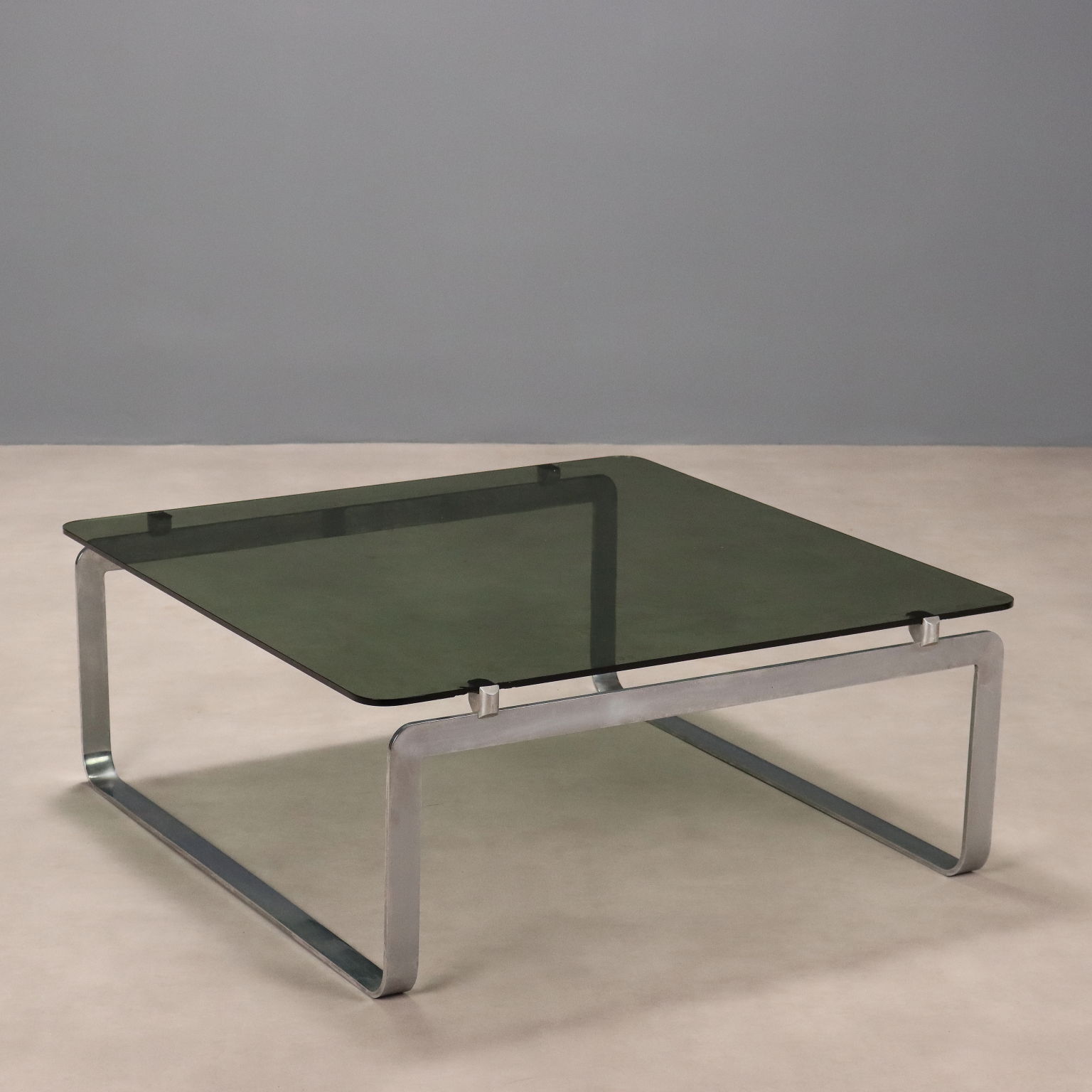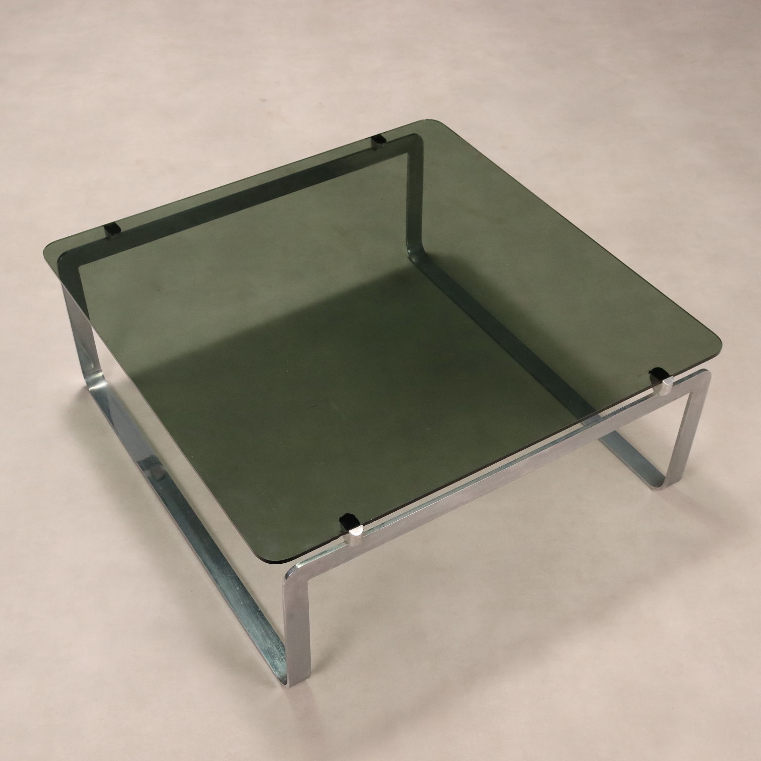 Table basse vintage de fabrication italienne, avec structure en métal chromé et plateau carré en verre fumé aux angles arrondis. Quelques petits éclats sur le verre, comme illustré sur la photo.