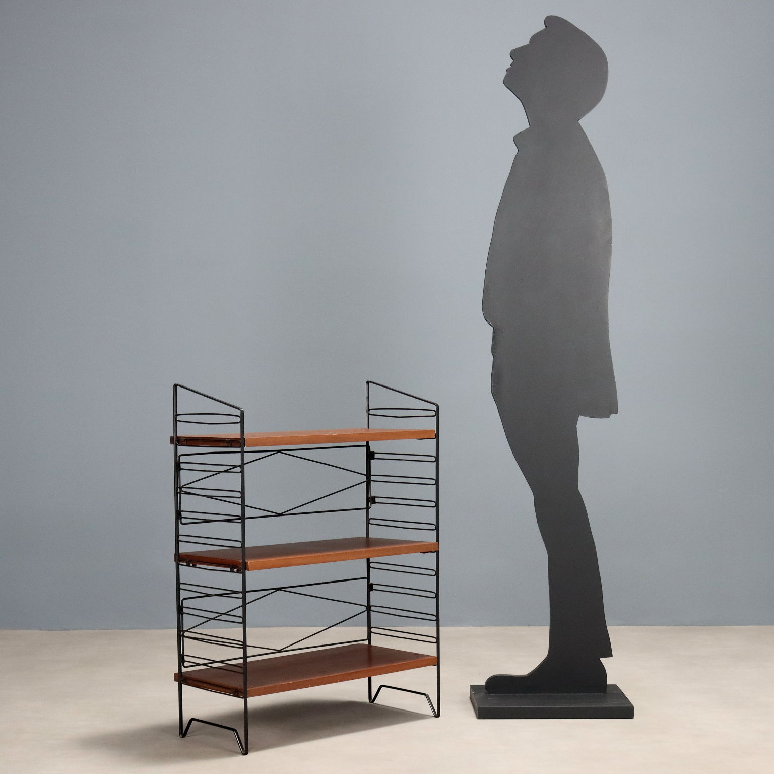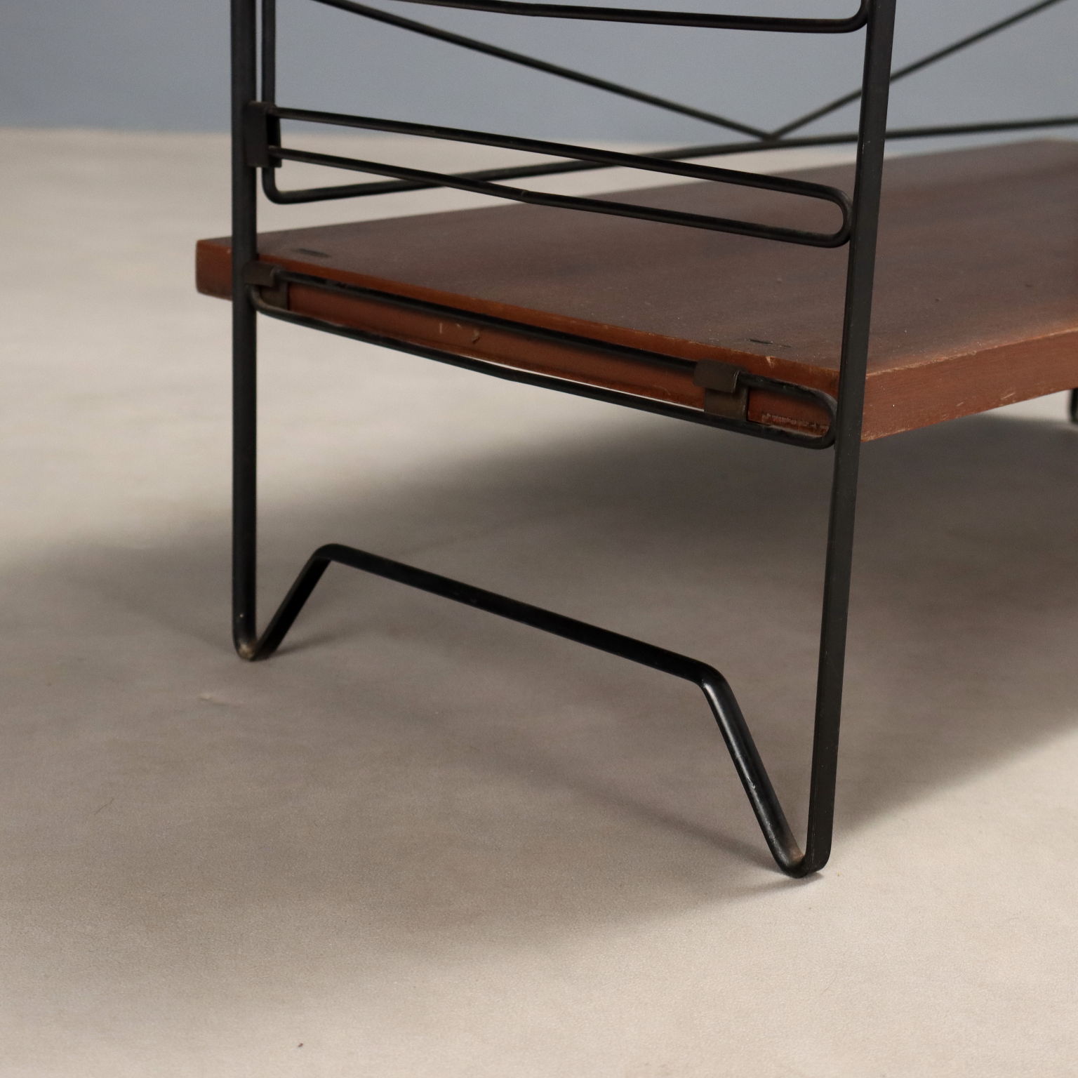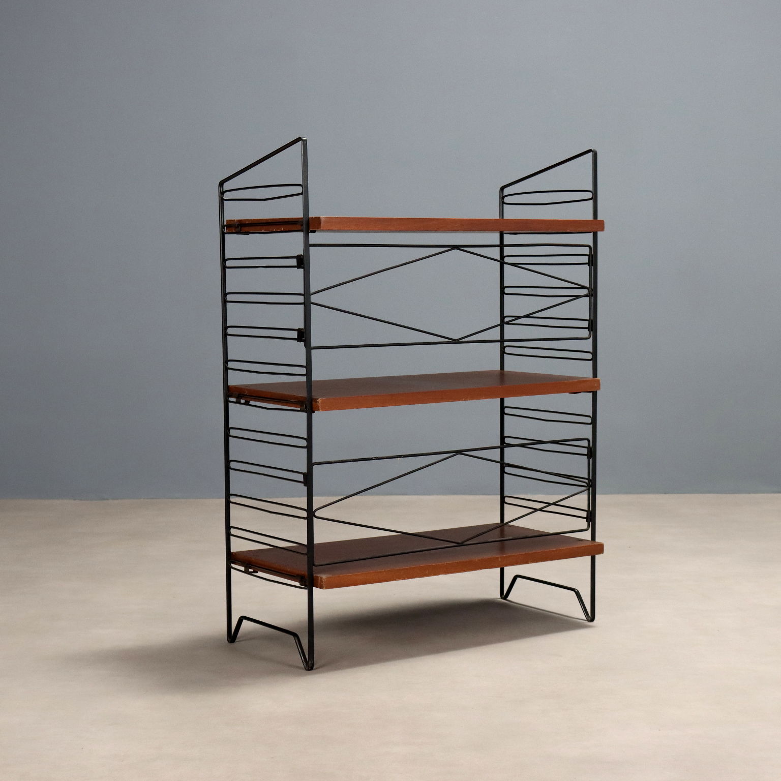 Petite bibliothèque vintage avec structure en métal émaillé noir, trois étagères réglables en placage de teck.