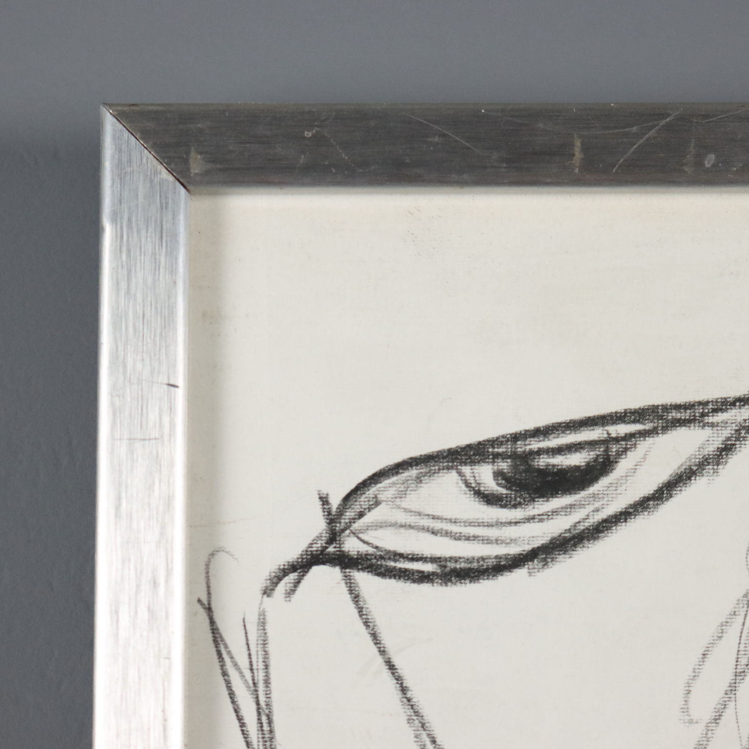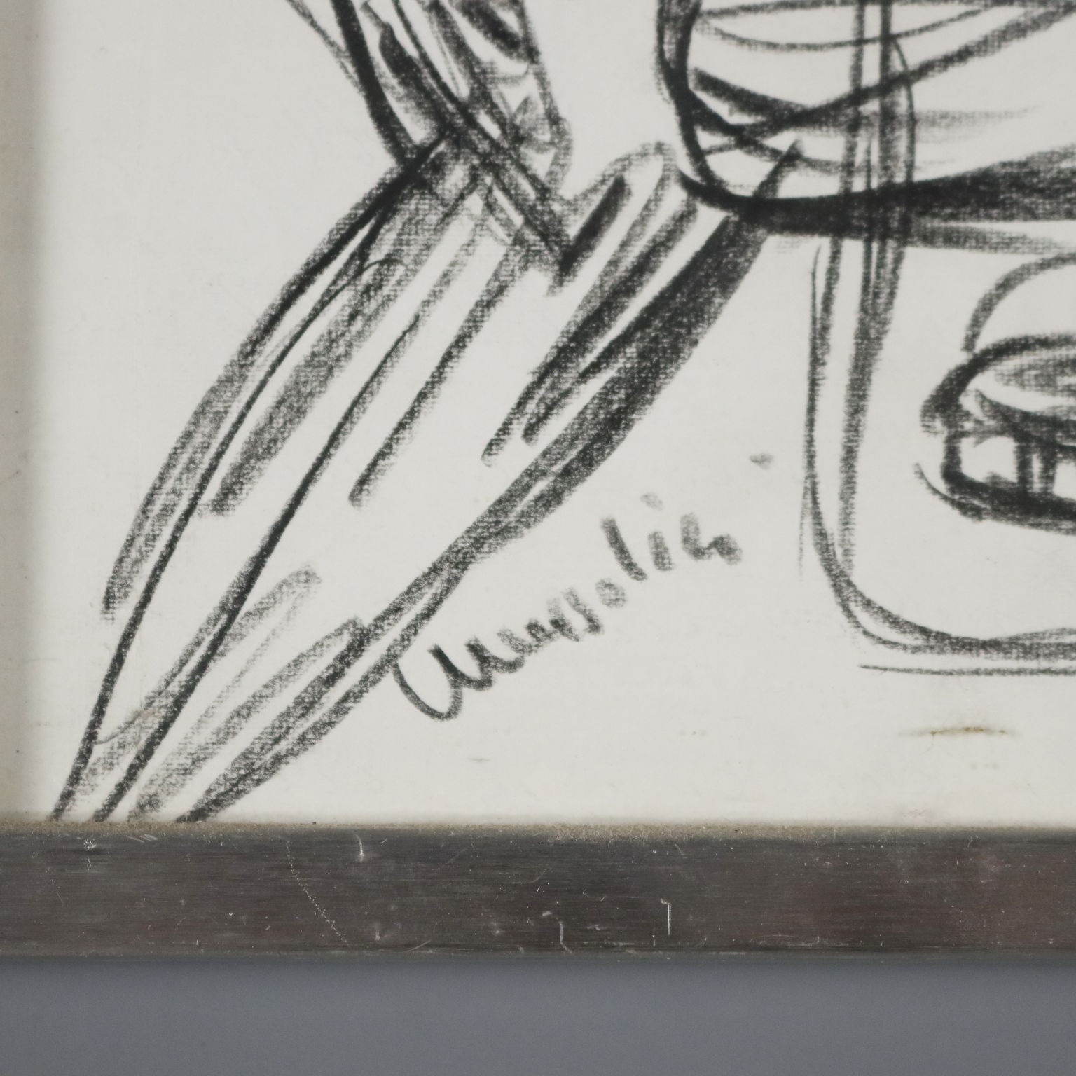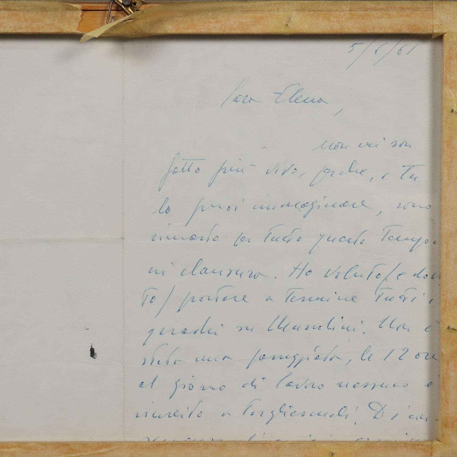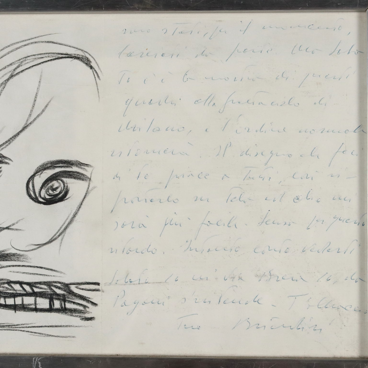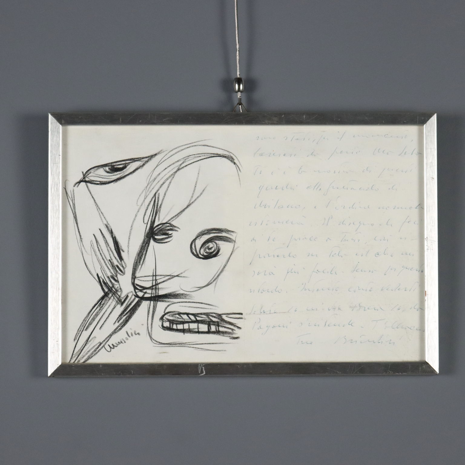 Dessin sur papier. Le dessin est signé en bas à gauche, la lettre est signée et datée. Il s'agit d'une lettre unique écrite par Brindisi à un ami en 1961, dans laquelle il raconte son combat pour travailler sur une série d'œuvres sur le fascisme, créées entre 1960 et 1961. La lettre est accompagnée d'un dessin, une esquisse pour l'œuvre grand format « La Dernière Nuit de Claretta Petacci et Mussolini » (huile sur toile, 180 x 200 cm), où les visages sont transfigurés de manière grotesque pour représenter l'horreur historique. Il s'agit de l'œuvre du célèbre peintre italien Remo Brindisi, dont la peinture, basée sur une approche descriptive et réaliste dans ses premières œuvres, a ajouté des nuances expressionnistes dans ses œuvres ultérieures, donnant naissance à son propre langage néofiguratif. Son œuvre est toujours imprégnée d'une intention sociale et politique. Brindisi a également travaillé comme sculpteur, illustrateur, écrivain, scénographe et commissaire d'exposition. Elle provient d'une collection privée milanaise. Encadrée.
