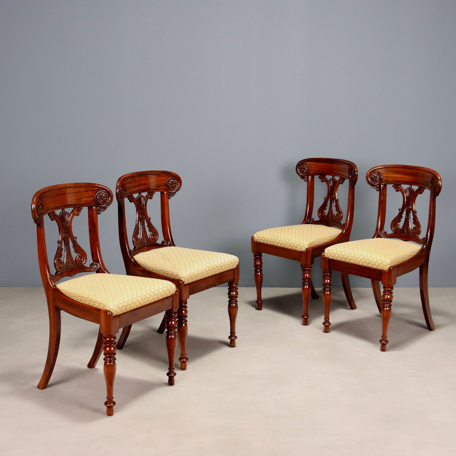 Ensemble de quatre chaises victoriennes en acajou. Dossier ouvert sculpté de volutes, de feuilles et de fleurs ; pieds avant tournés et pieds arrière en sabre. Assise rembourrée amovible. Angleterre, deuxième quart du XIXe siècle.
