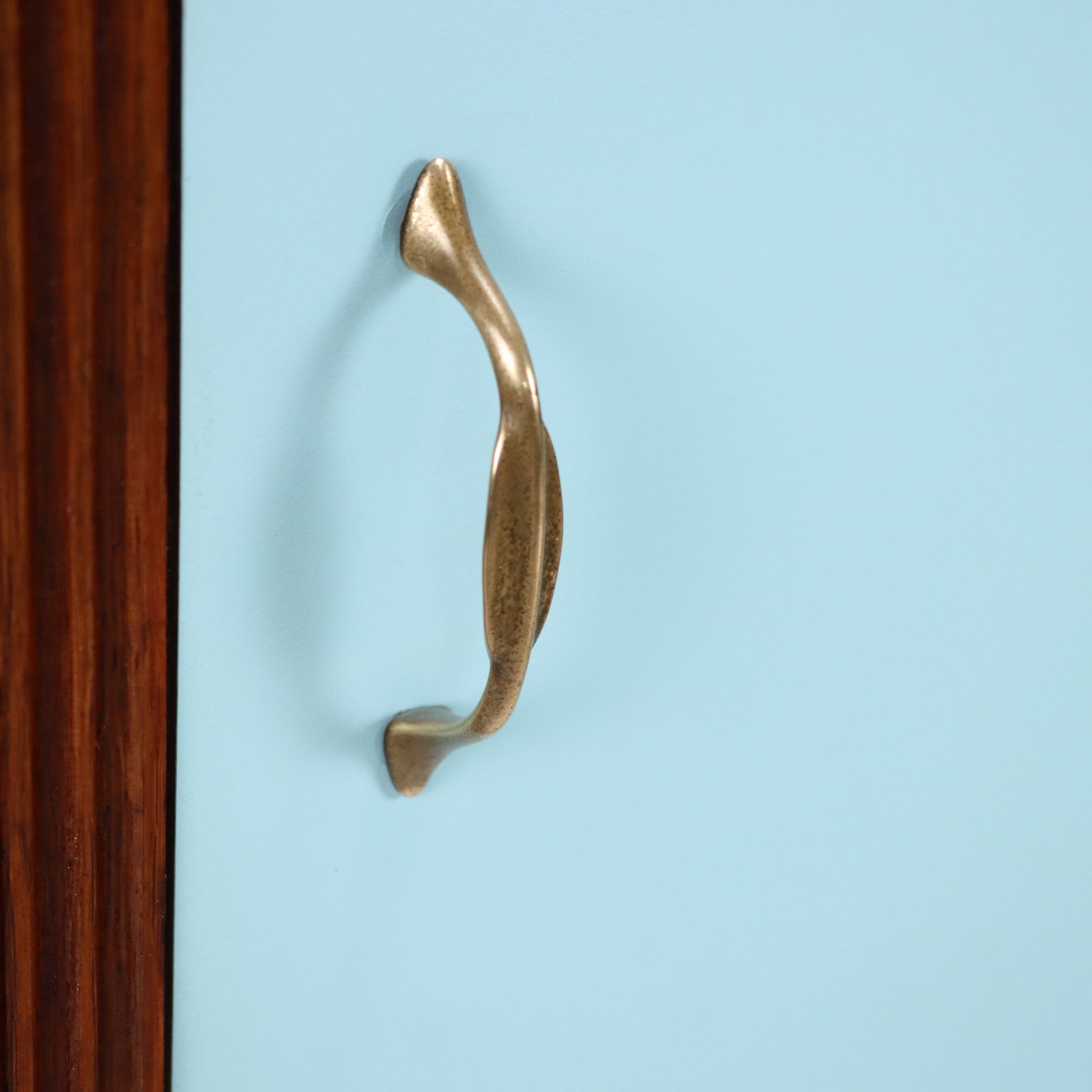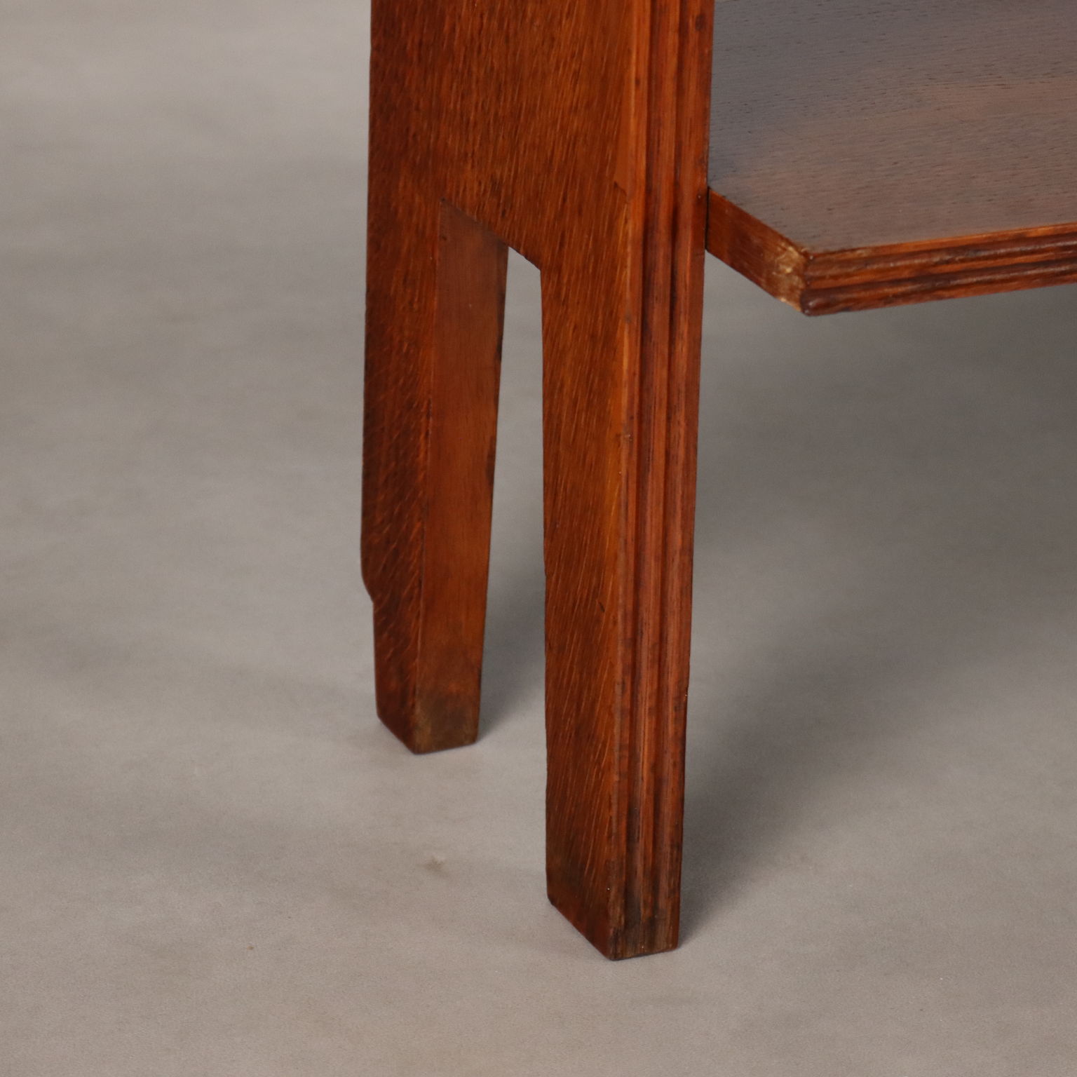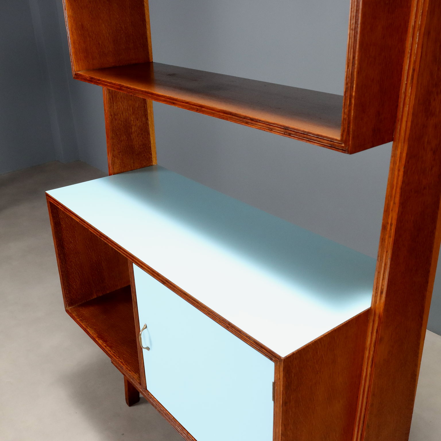 Bibliothèque vintage simple travée en placage de chêne avec inserts en laminé. Elle comprend des compartiments ouverts et un compartiment de rangement avec porte battante et poignée en laiton. Restaurée dans notre atelier.