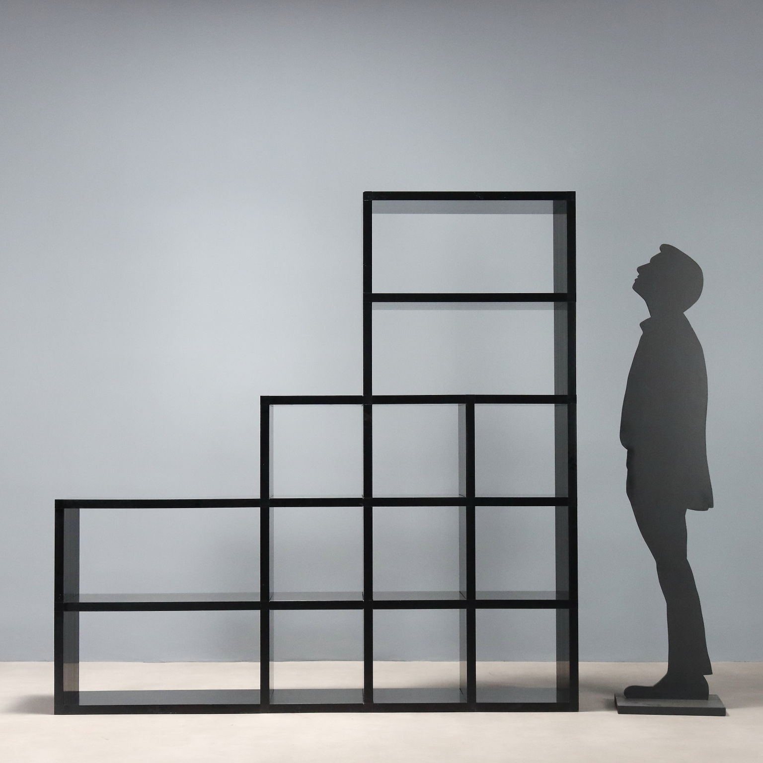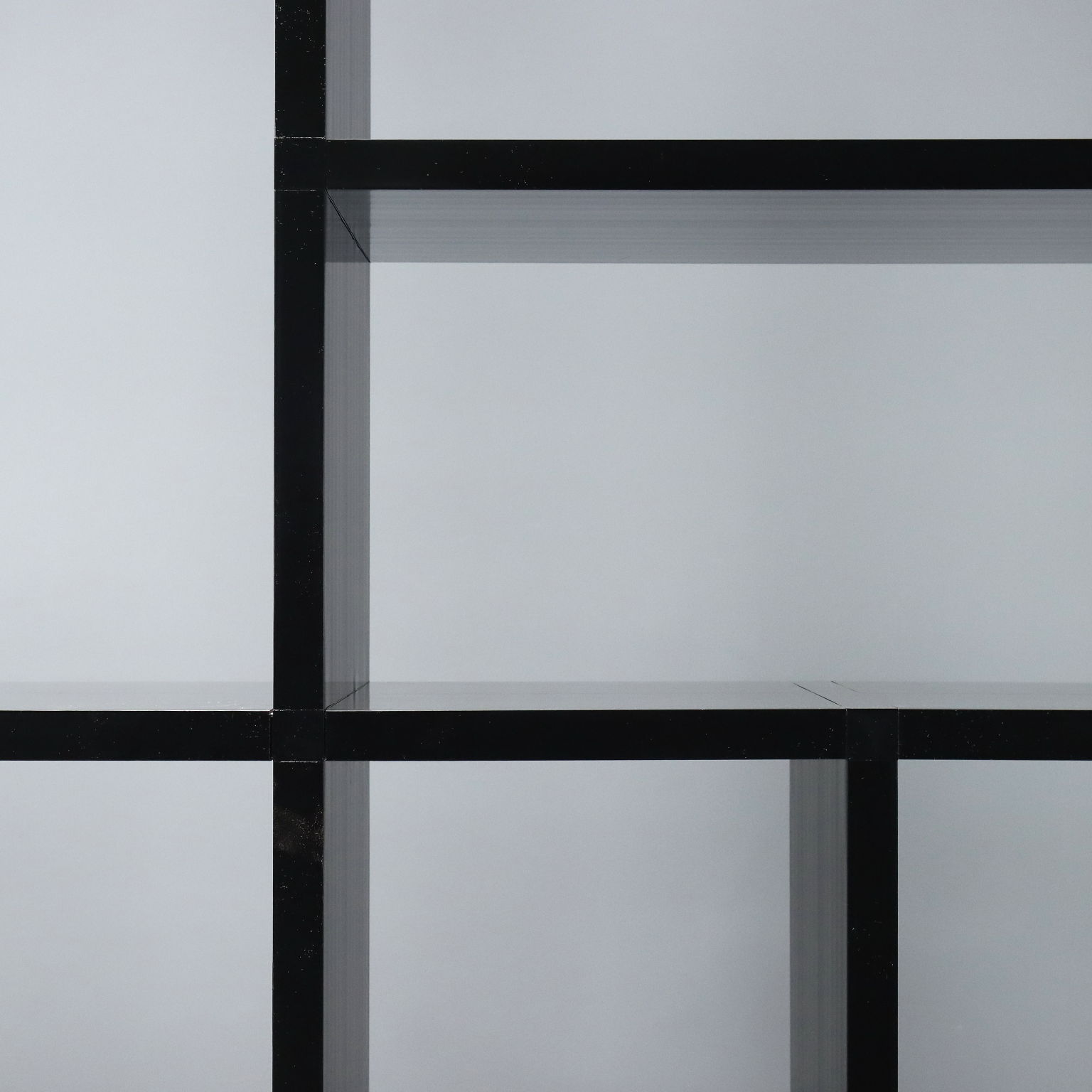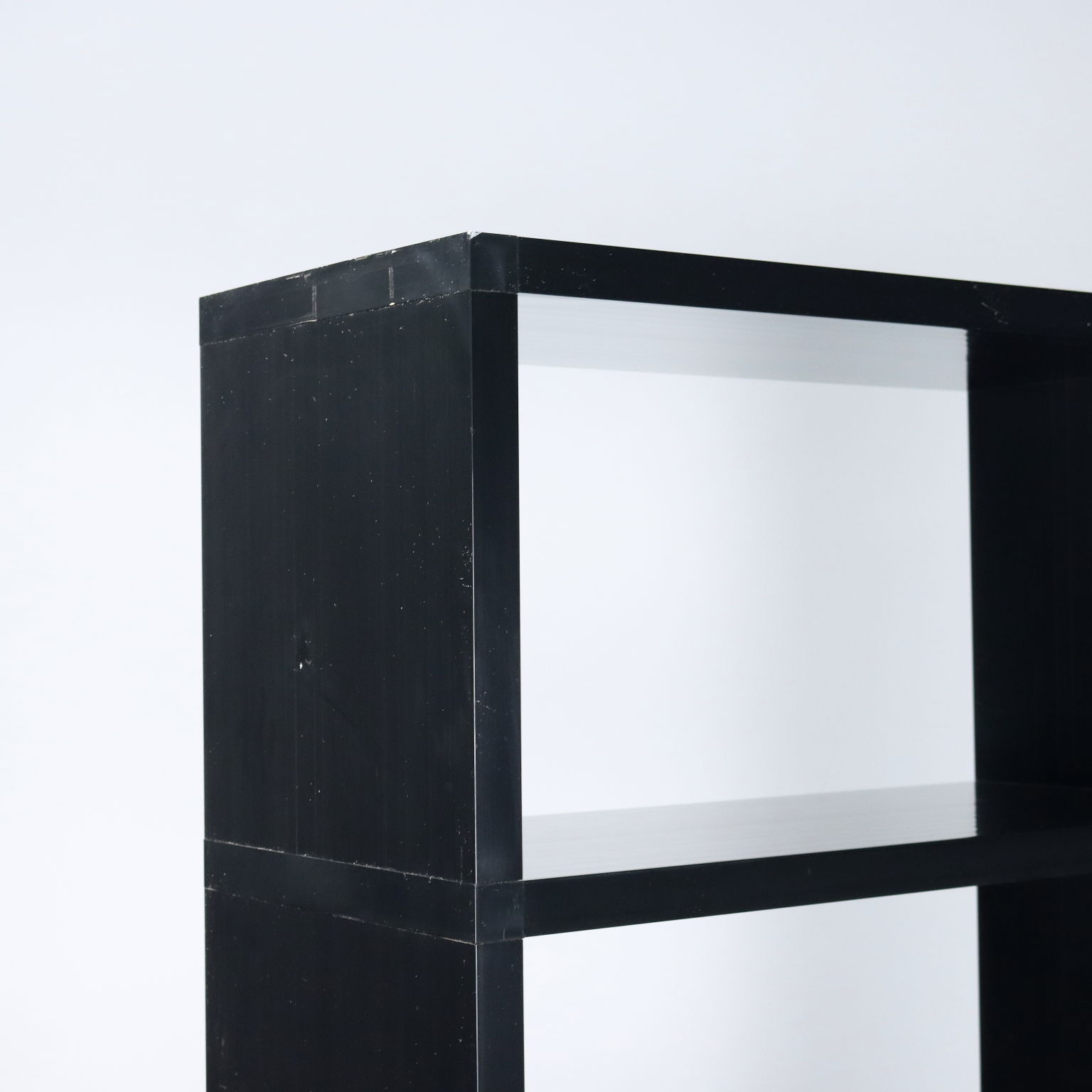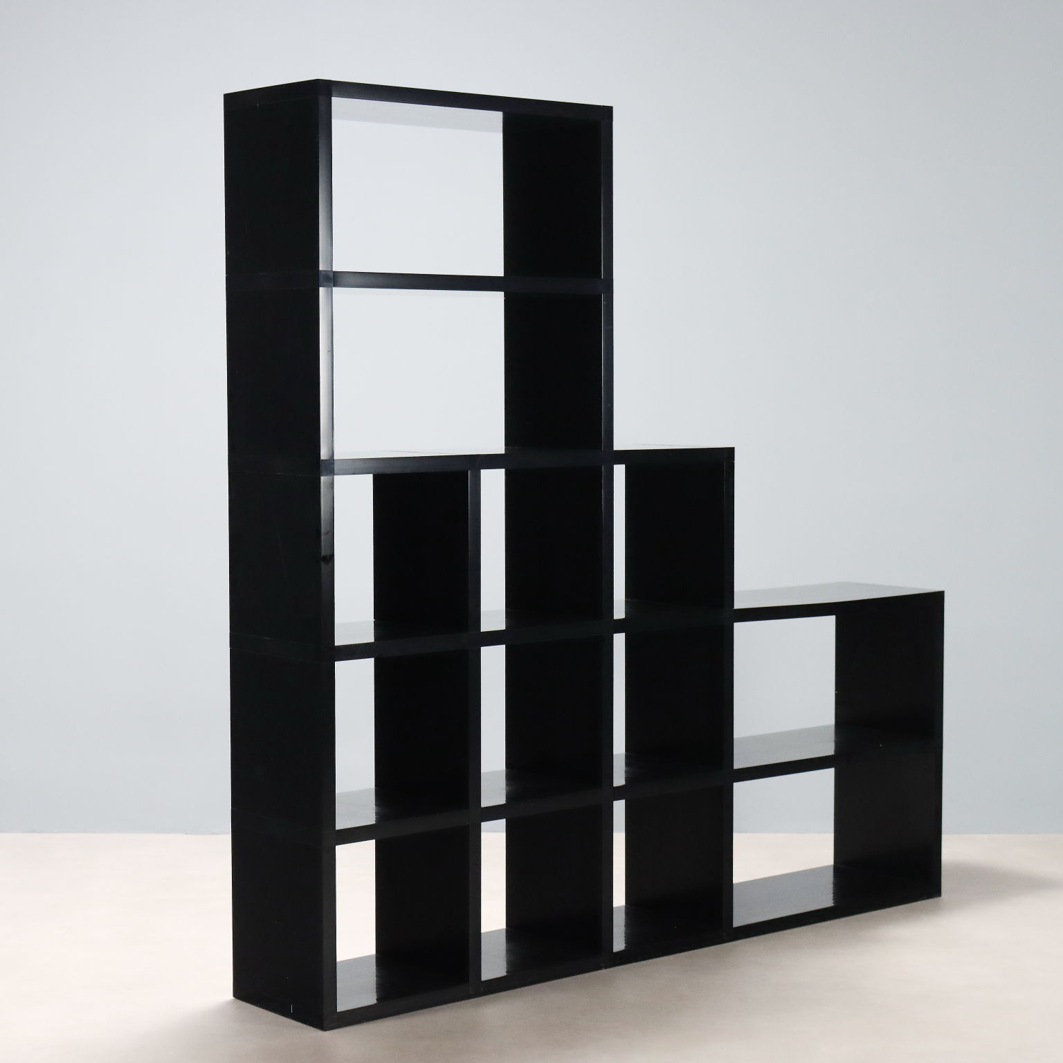 Bibliothèque modulaire en matière plastique noire avec éléments de position réglables.