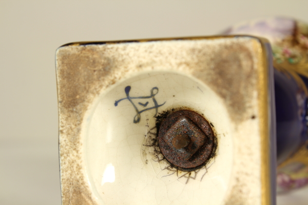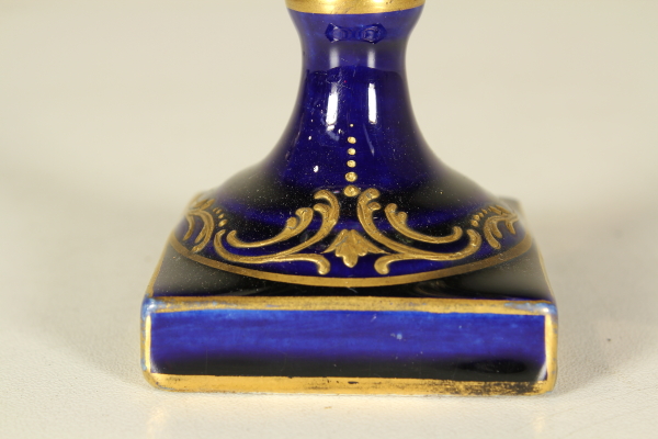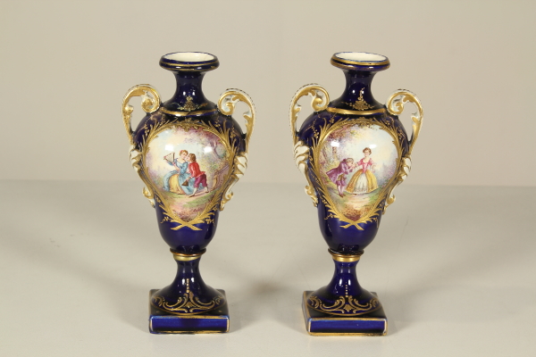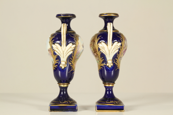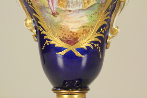 Paire de vases en porcelaine de Sèvres. Scènes du XVIIIe siècle peint à la main et paysages lacustres, encadrés dans des décors dorés.