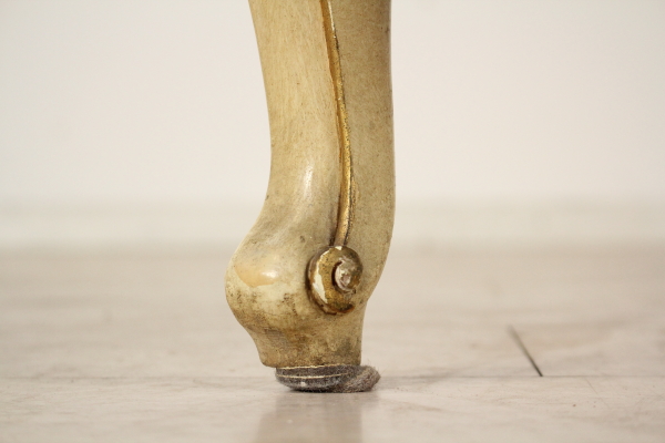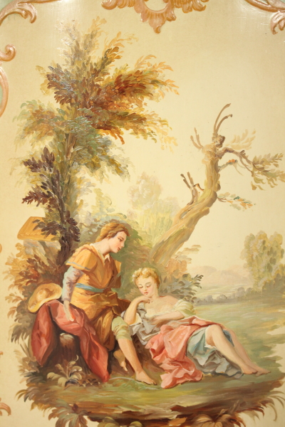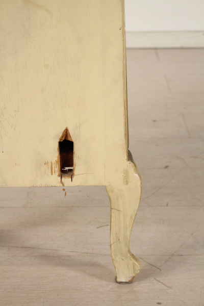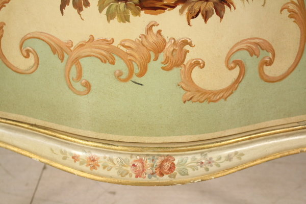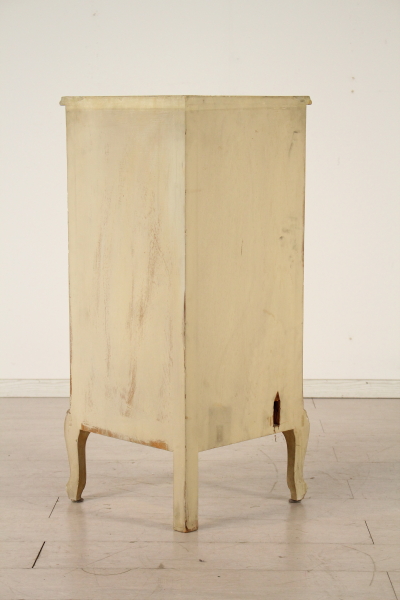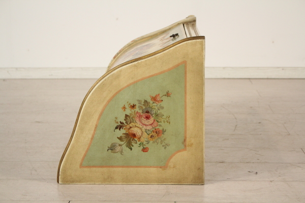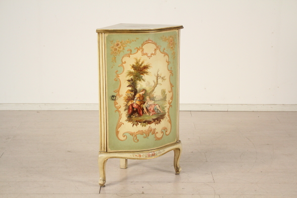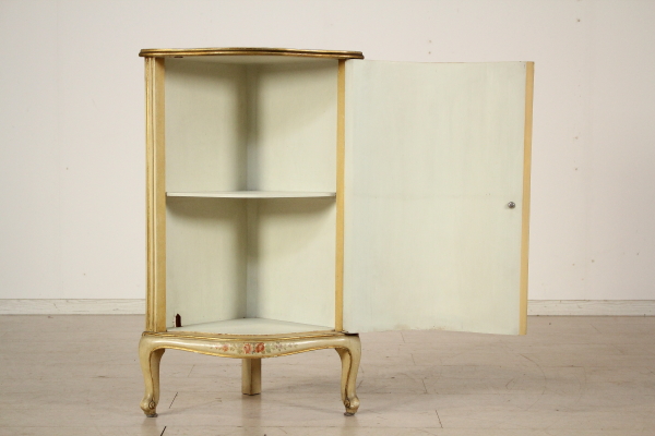 Encoignure laqué. De la ligne de front est passée pieds sculptés. Porte peinte avec des éléments décoratifs à la craie en relief. Décorations florales en polychromie.