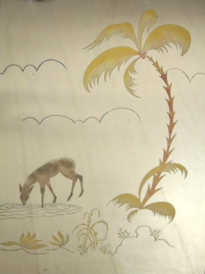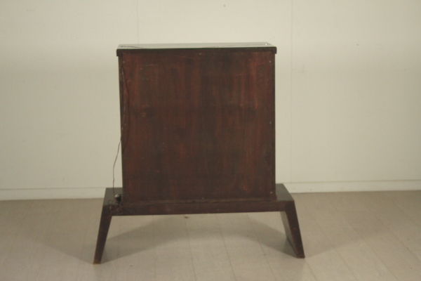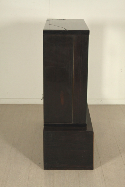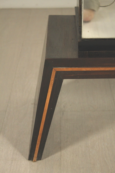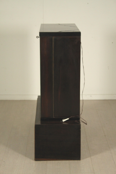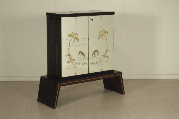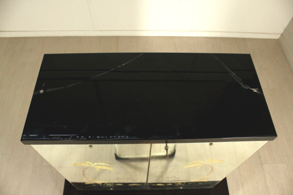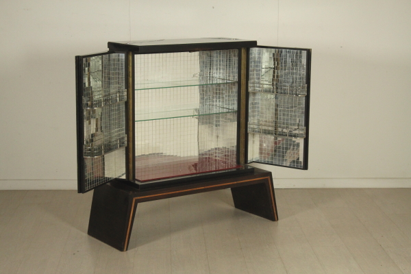 Wetbar : bois plaqué ébène vitrail retour verni, intérieur recouvert de miroirs et de portes avec miroirs décorés. Discrètes conditions, présente peu de signes d'usure, fissures sur le verre.