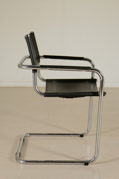 Fauteuils d'inspiration piétement luge par Mart Stamm ; métal chromé, imitation cuir. Fair condition, montrent des signes d'usure.