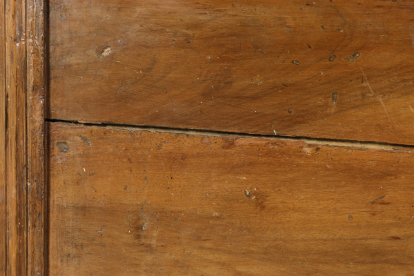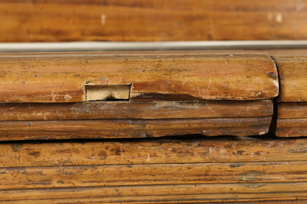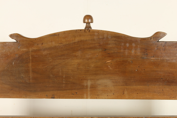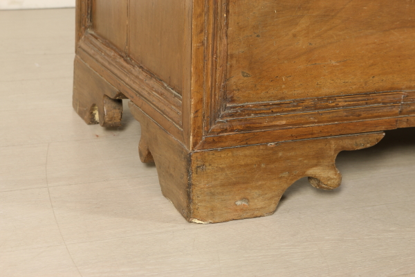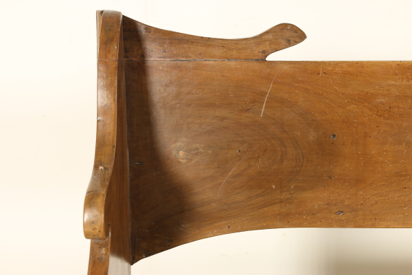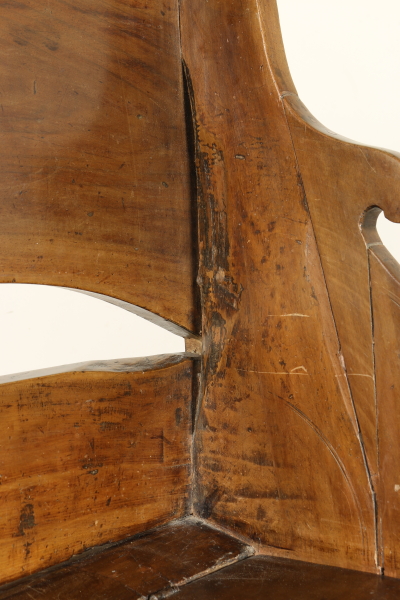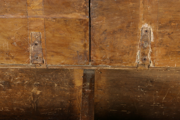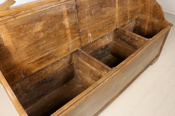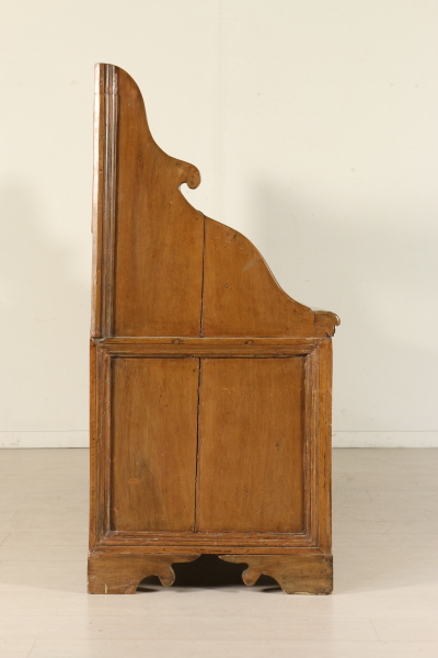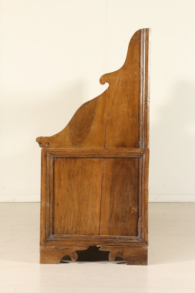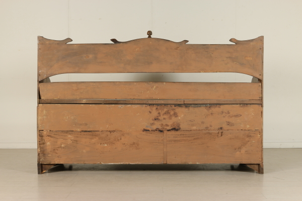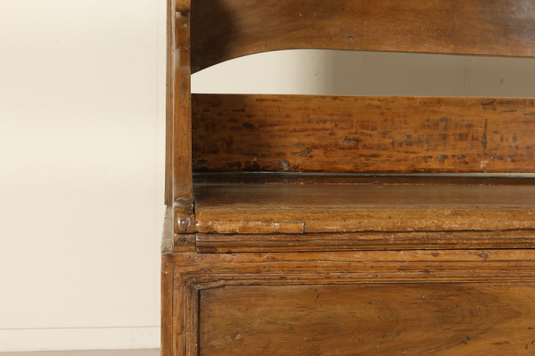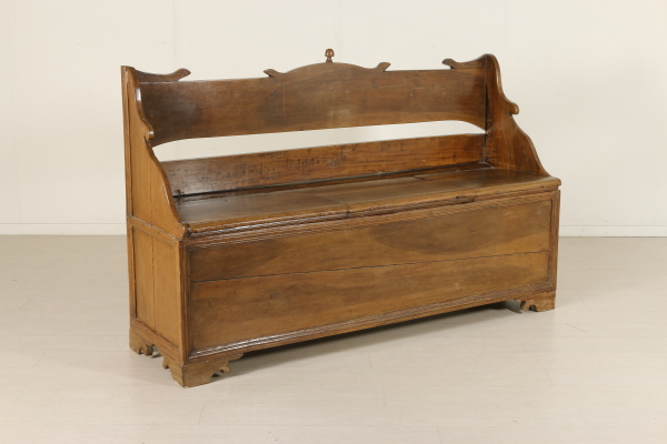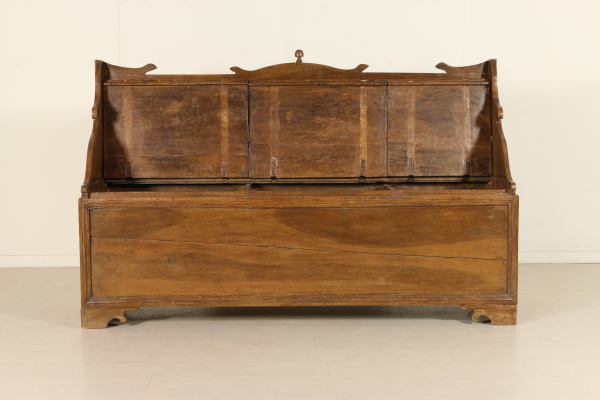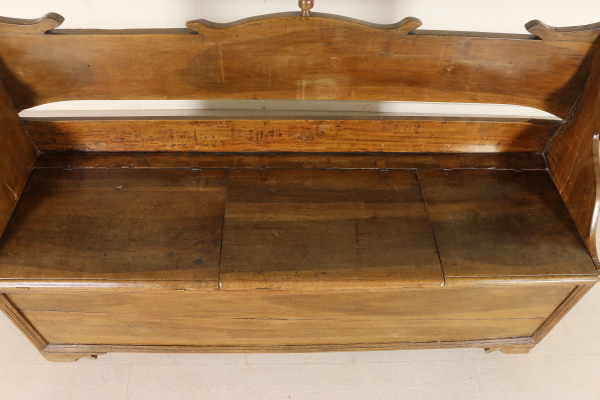 Coffre avec dossier et accoudoirs et sculpture. Plan d'ouverture tripartite. A subi des rénovations.