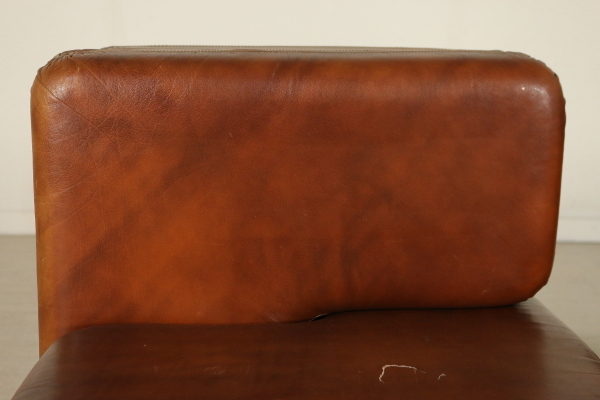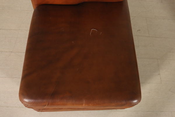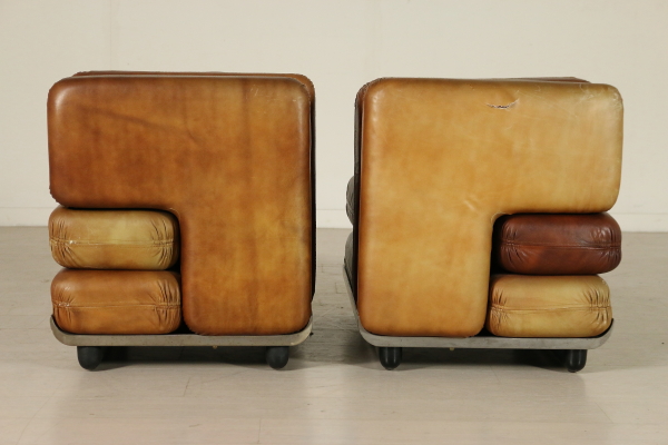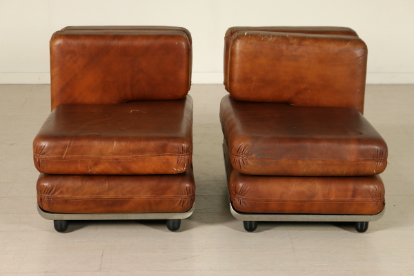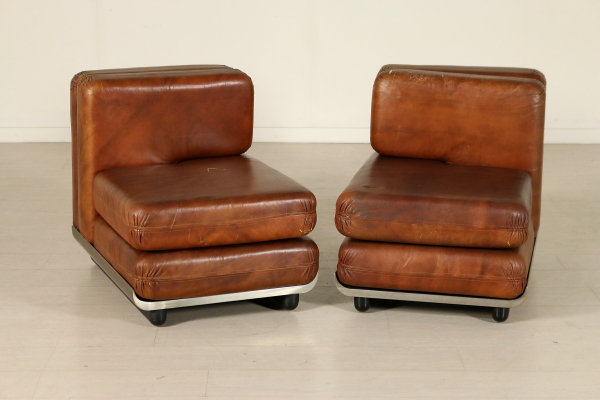 Paire de fauteuils ; métal, rembourrage en mousse, sellerie cuir. Fair condition, montrent des signes d'usure, coupures sur la doublure.