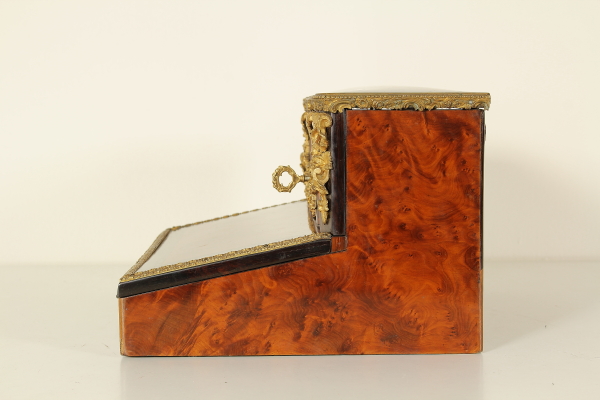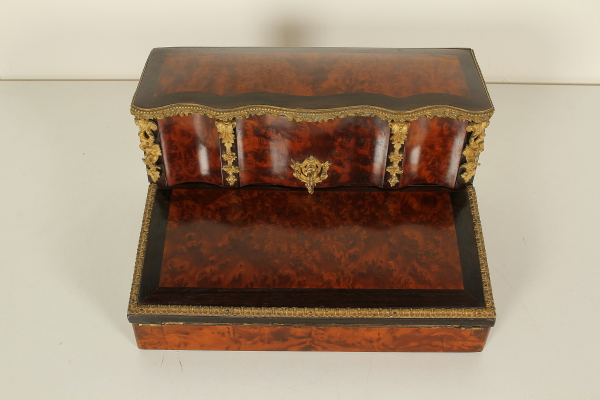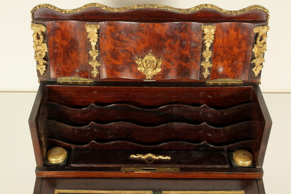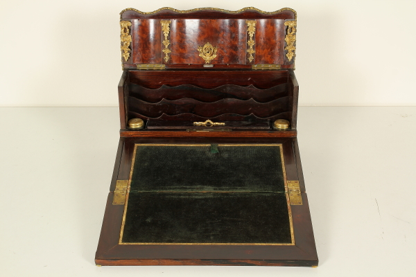 Plancher de scène d’ouverture avec insert de velours. À l’intérieur des chambres incluant les encriers et porte lettres. Applications de bronze finement ciselées et dorées. La qualité de l’objet en plus du matériel utilisé peut être vu des charnières d’une seule pièce et ciselage de la fusion des cils qui longent les plans.