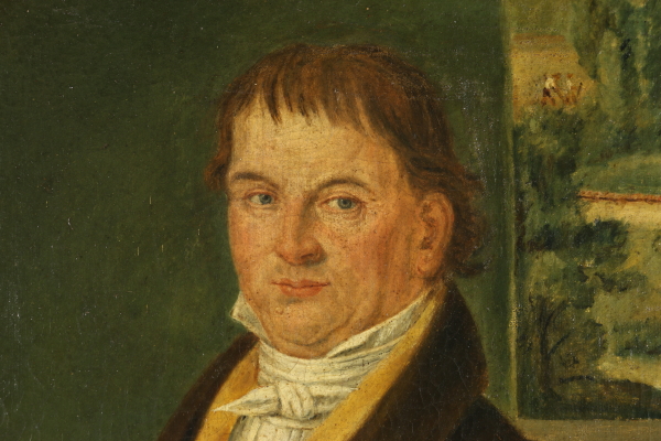 Huile sur toile. Il dépeint un noble identifié par la mention à la base "le noble Giò Fran. Piouani, né en 1764 est mort le 25 juin 1834 eux "et flanqué par le blason familial. Dans le cadre.