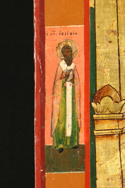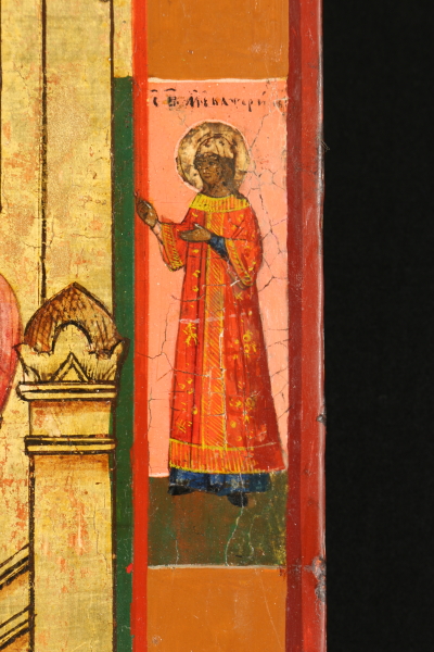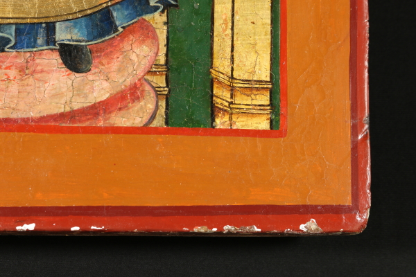 Egg tempera sur bois, or sur le sol. Christ au centre, avec sa mère sur sa droite et St Jean Baptiste à sa gauche, aussi bien dans l’attitude de supplication, constituent l’iconographique forme dit Deesis (i.e. la prière), ce qui signifie le sens de la prière d’intercession des Saints se tourna vers Christ à son retour à la fin des temps. Le Deesis est, dans le rite byzantin-slave, le centre idéal de l’iconostase. Accompagné par le certificat d’authenticité avec photo.
