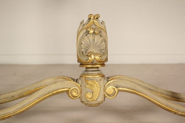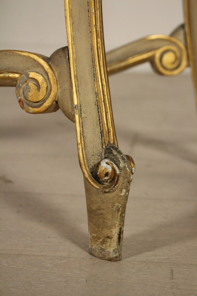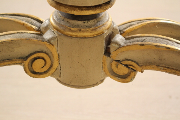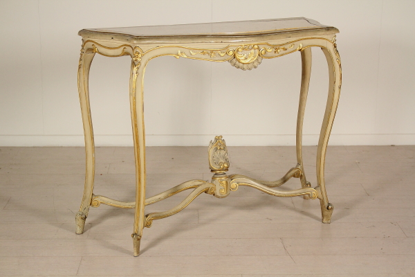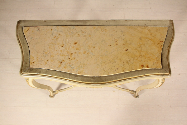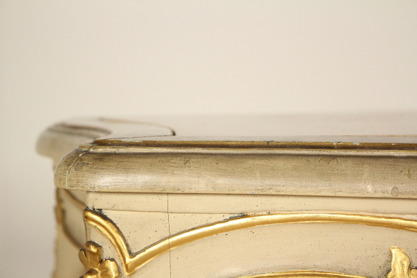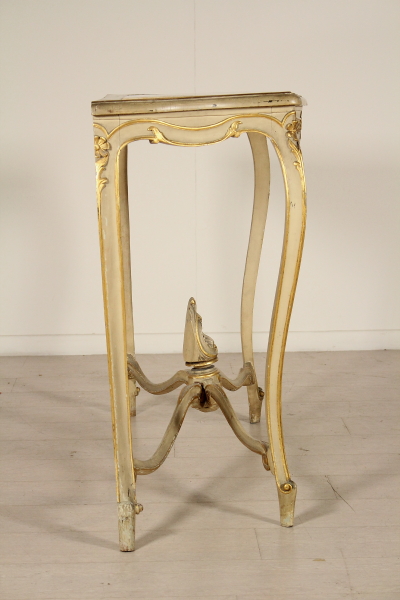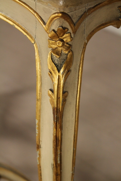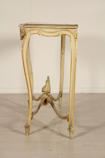 Laqué avec des sculptures dorées. Dessus de marbre encastré.