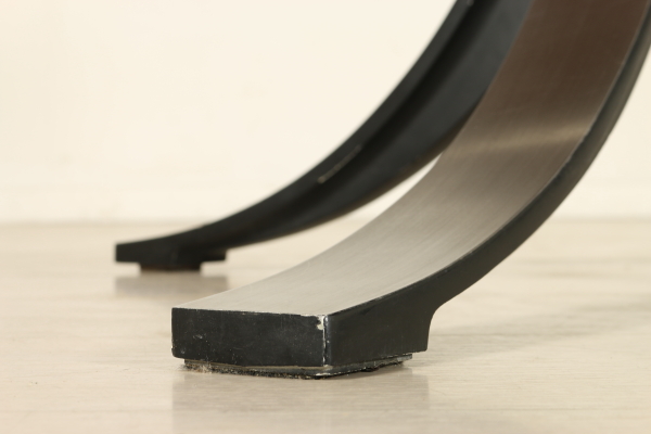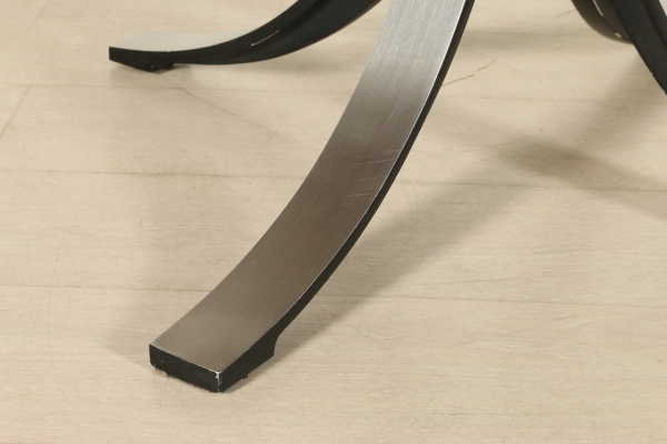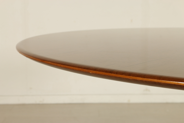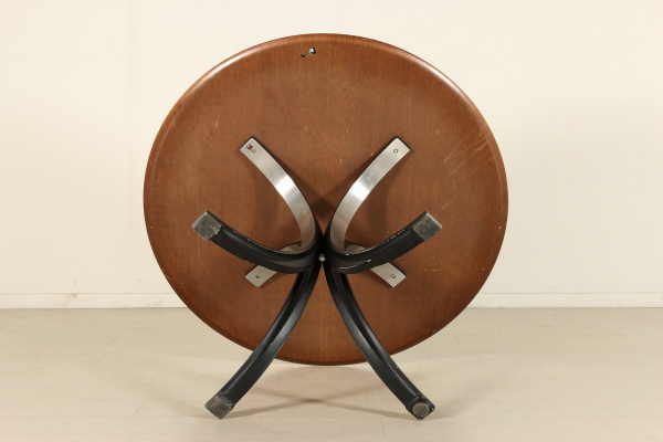 Table ronde ; armature en acier, piano en acajou plaqué nickel. Bon état, montre peu de signes d'usure.