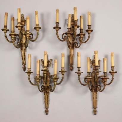 Coppia di torcieri in ferro battuto verniciato, poggianti su base trepiede, presentano inserti in bronzo dorato. Paralumi in tessuto bordeaux e ricami. Italia, fine XIX Secolo.