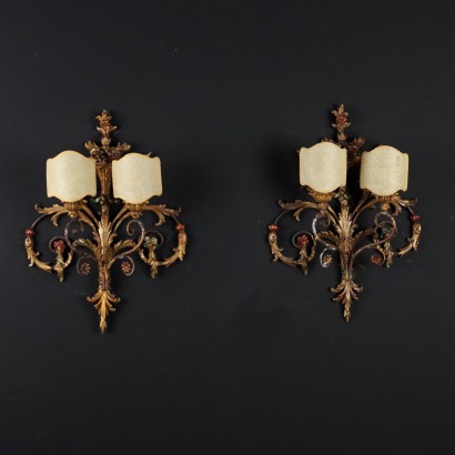 Coppia di lampade a soffitto in alluminio smaltato e vetro bianco.