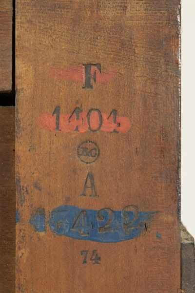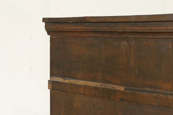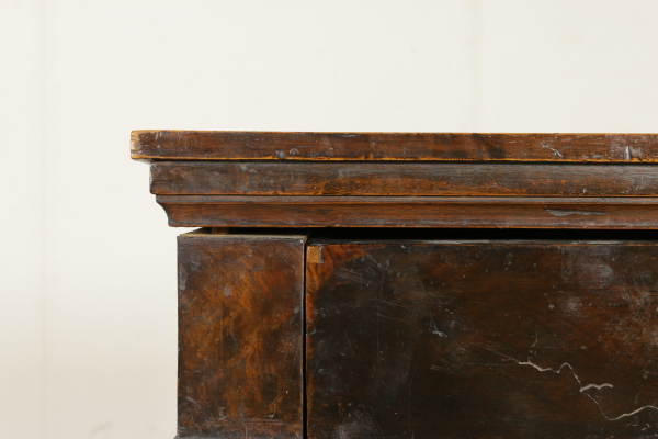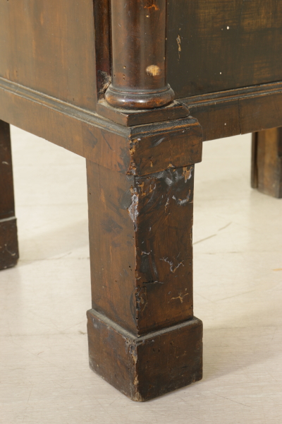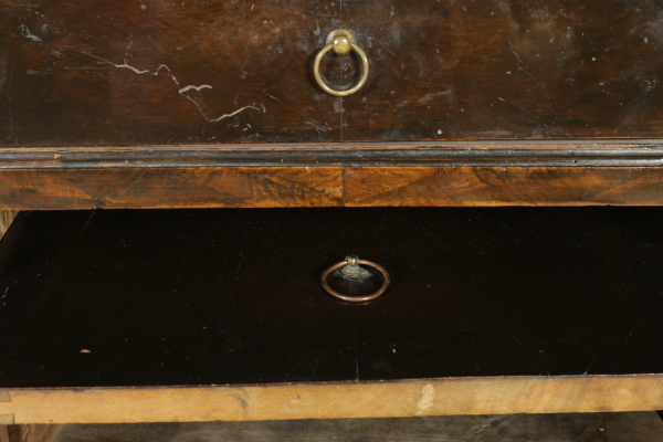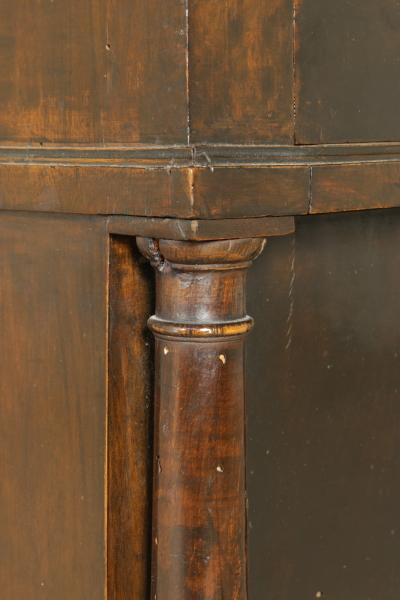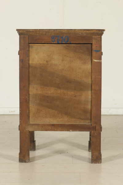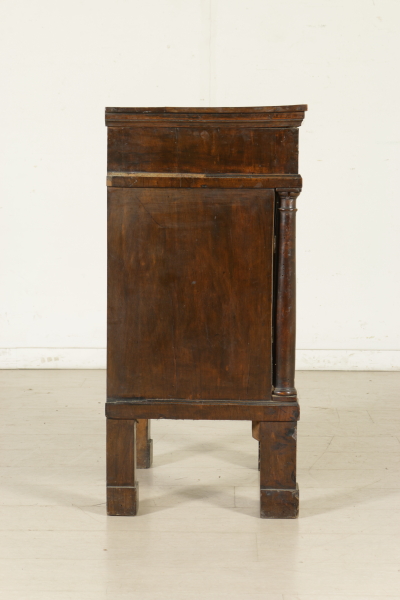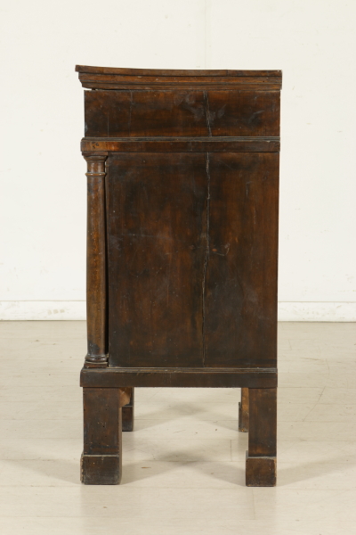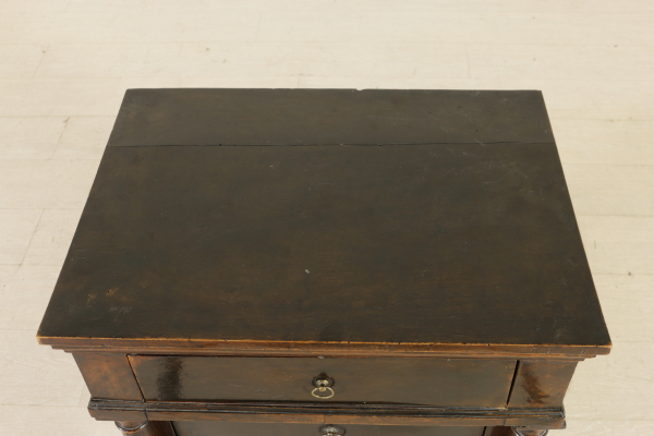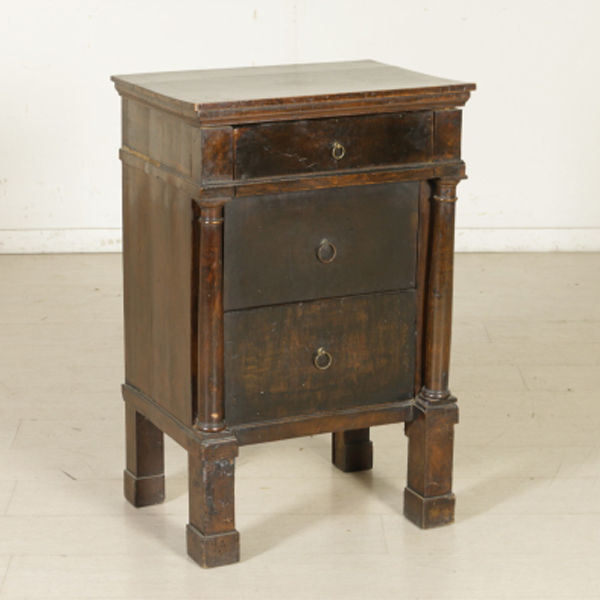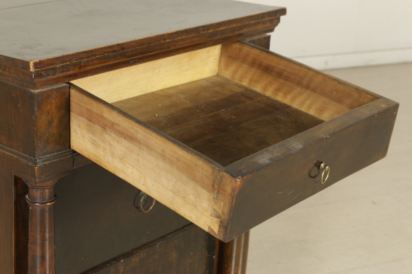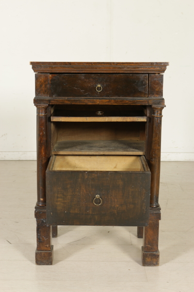 Comodino Impero. Montanti a plinto con colonne tornite. Due cassetti e anta a ribalta. Noce massello.