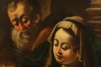 Olio su tela. La scena è centrata sul Bambin Gesù che infila l'anello nuziale al dito della Santa, sotto gli occhi vigili e amorevoli di Maria e Giuseppe, sullo sfondo di strutture architettoniche. Restaurato e ritelato.