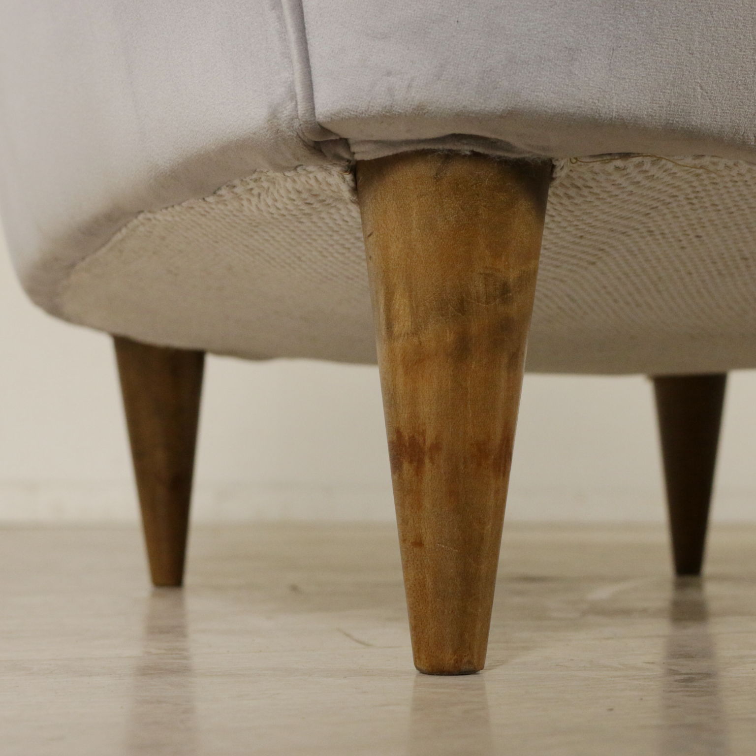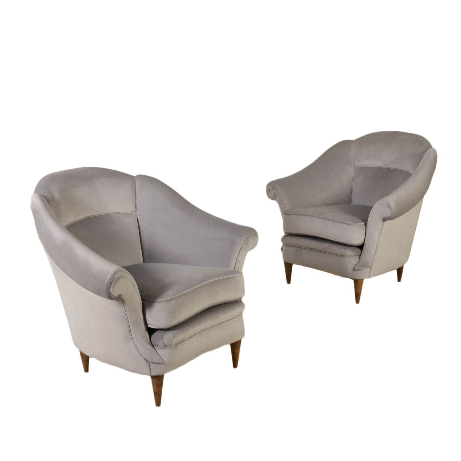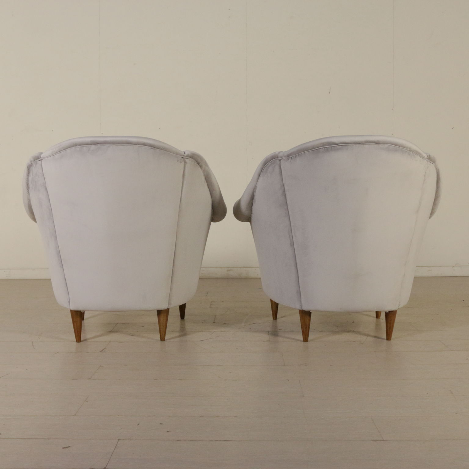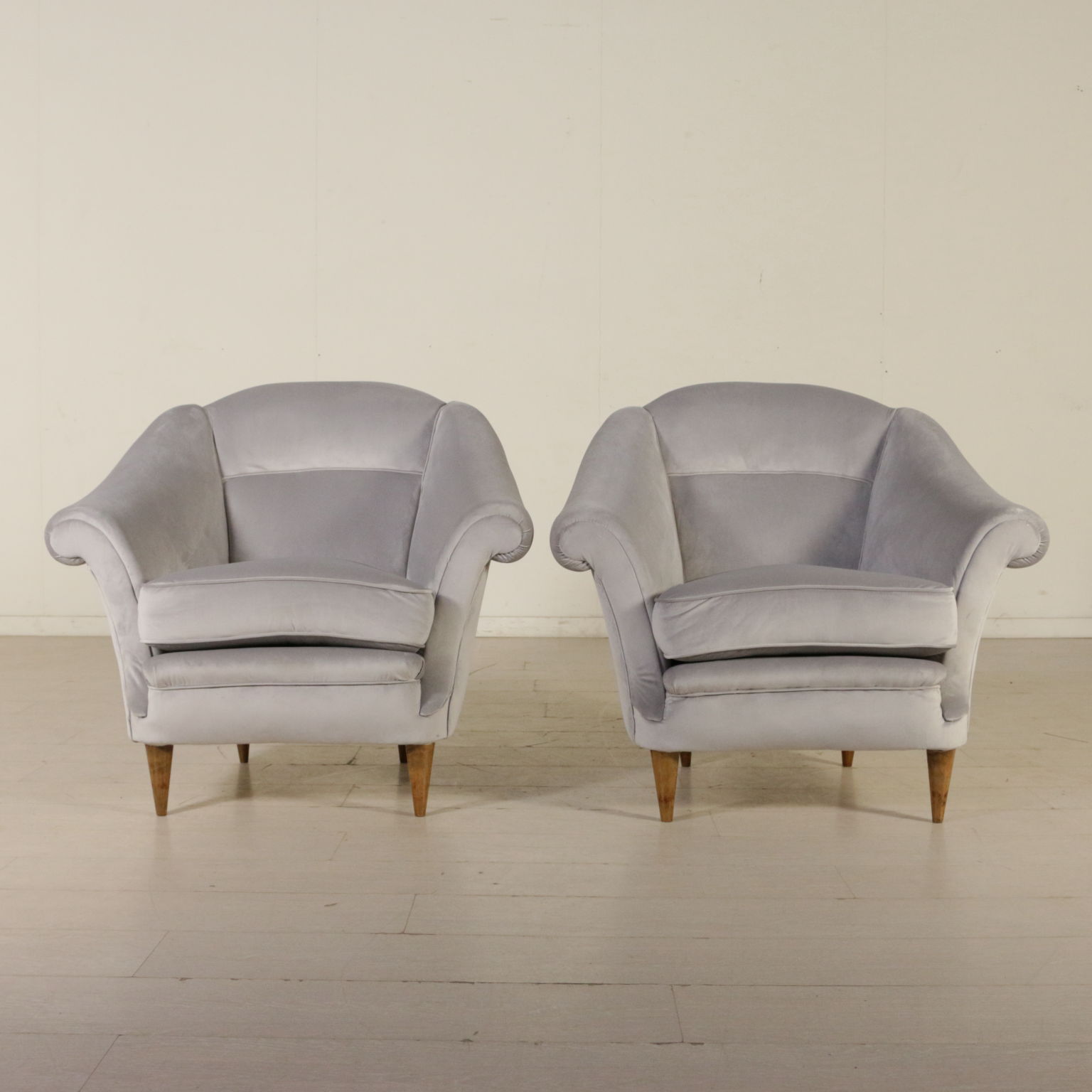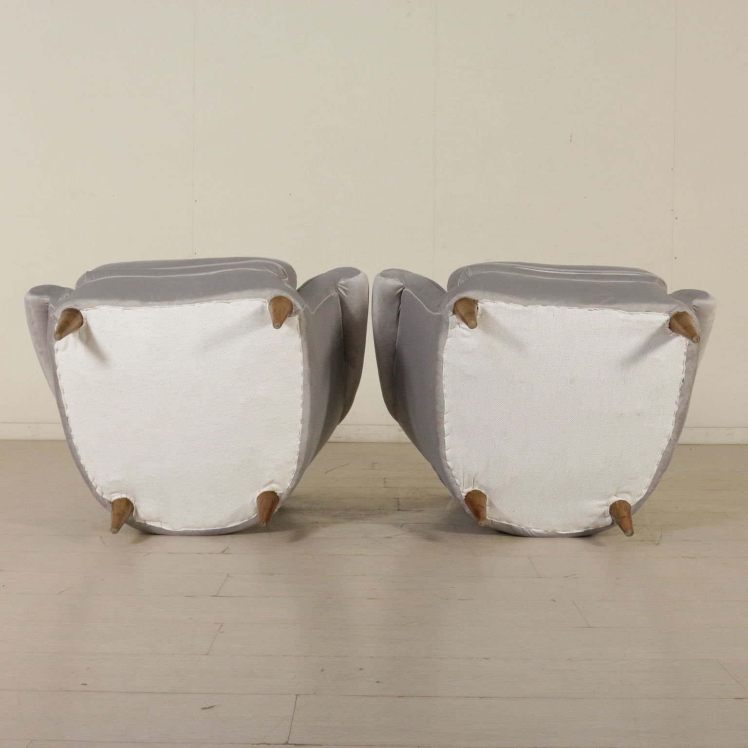 Coppia di poltrone; imbottitura a molle, rivestimento in velluto.