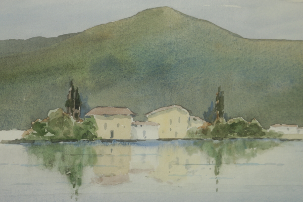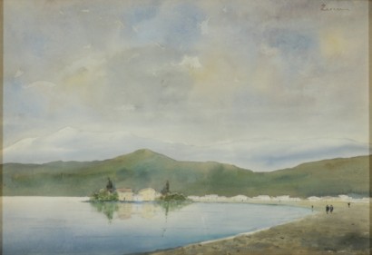 Giovan Battista Zaccaria (1902-1966), Paesaggio lacustre. Acquarello su carta. Firmato in alto a destra. Firmato in basso a destra. Nato a Palermo nel 1902. Morto a Milano nel 1966. Ha partecipato a numerose mostre collettive nazionali come la Permanente di Milano ed internazionali, in Inghilterrra, U.S.A. e SudAmerica. Sue opere sono collocate alla Galleria d' Arte Moderna di Milano, nel Museo Nazionale di Los Angeles e in altri musei all' estero. In cornice con vetro.