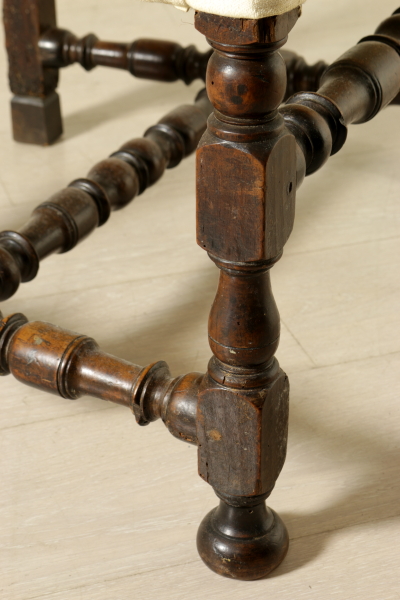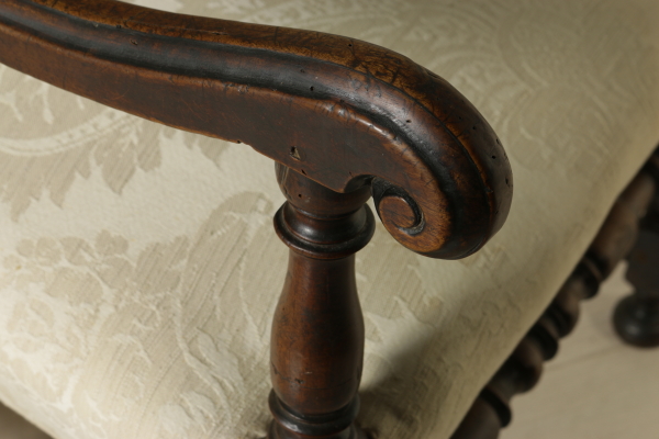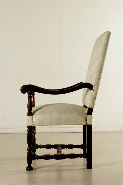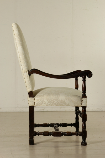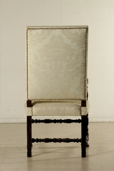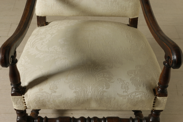 Trono a rocchetto presenta braccioli mossi terminanti a ricciolo. Seduta e schienale imbottiti. Effettuati restauri.