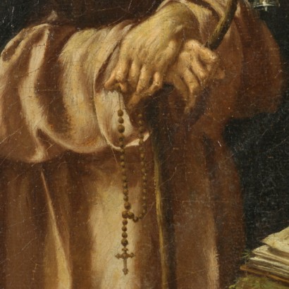Olio su tela. Il Santo, considerato uno dei fondatori del monachesimo, è qui raffigurato con i suoi attributi iconografici (il bastone da pellegrino sormontato da un campanello), mentre medita davanti a un testo sacro e al Crocifisso. I caratteri di scrittura del libro, attenti alla resa dettagliata e realistica, fanno ipotizzare una influenza fiamminga. Restaurato e ritelato.