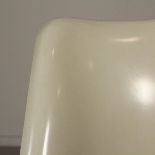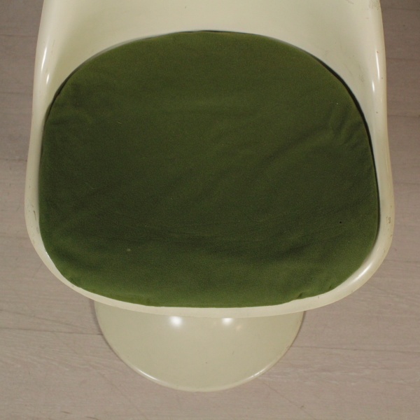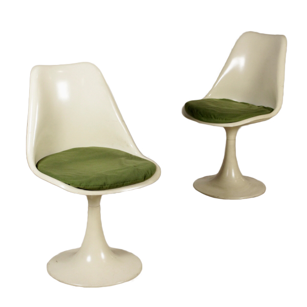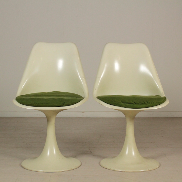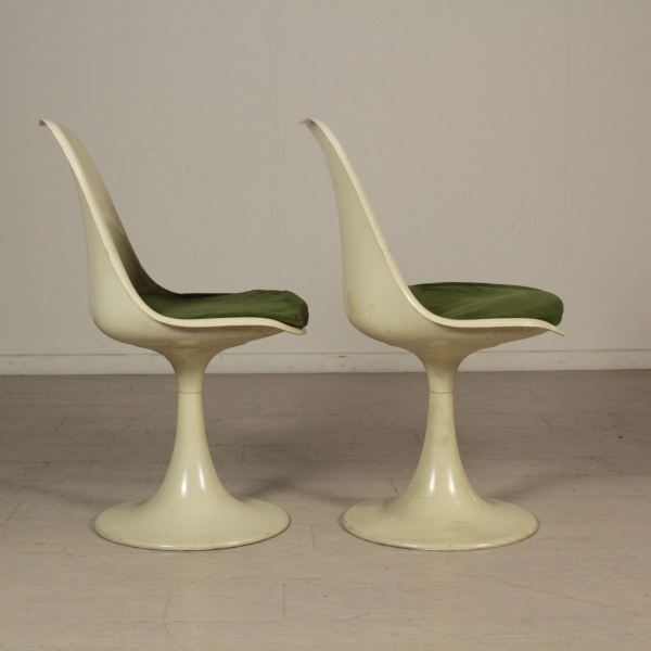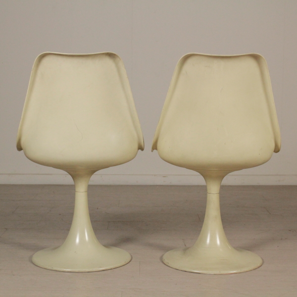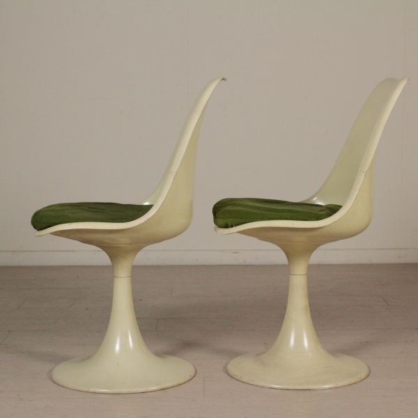 Coppia di sedie girevoli; base in metallo, scocca in materiale plastico, cuscini in espanso, rivestimento in tessuto.