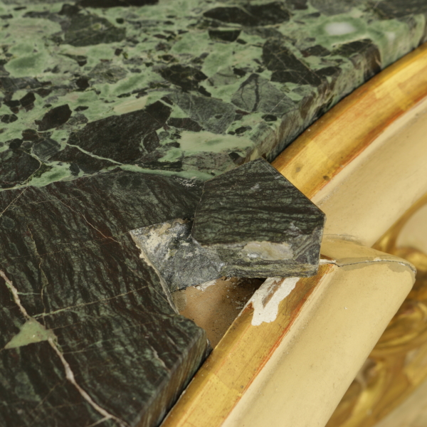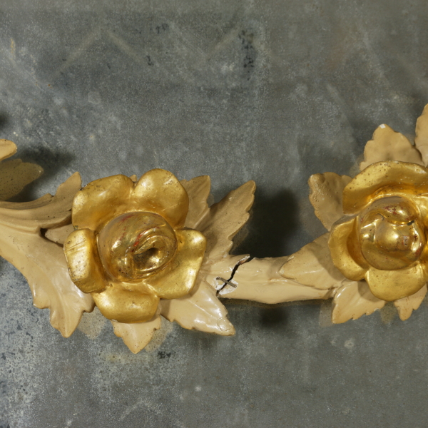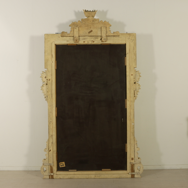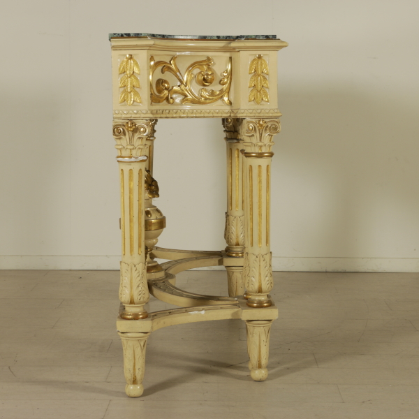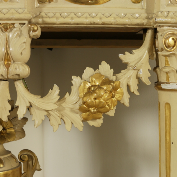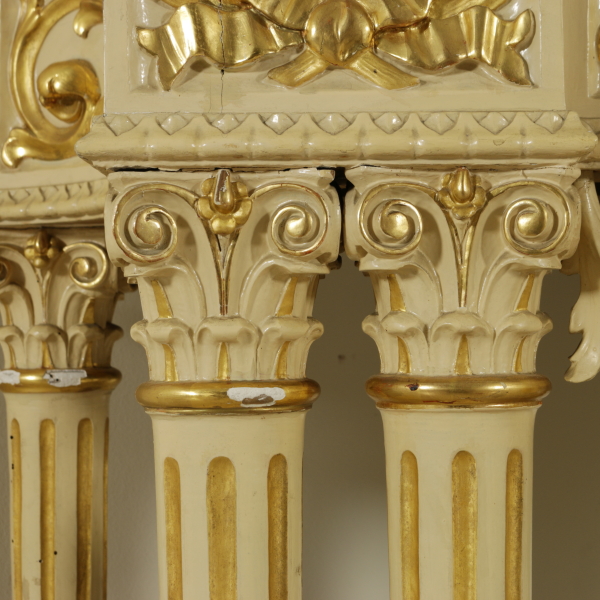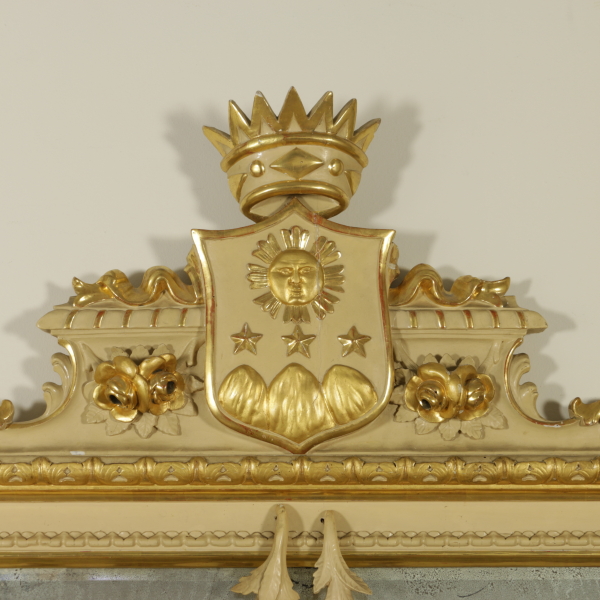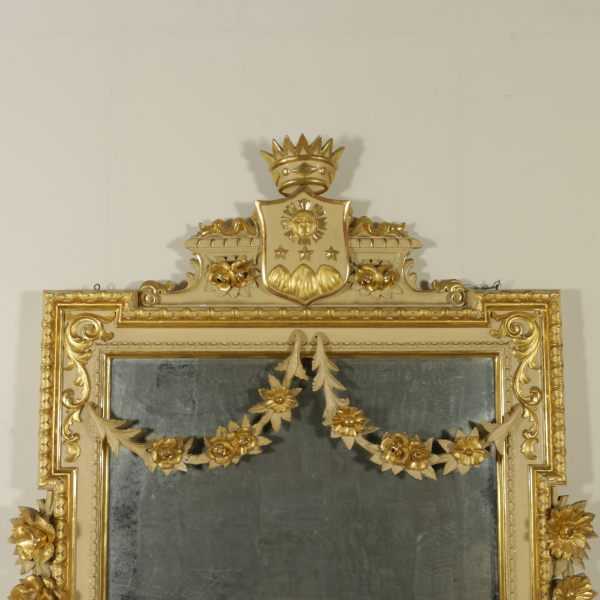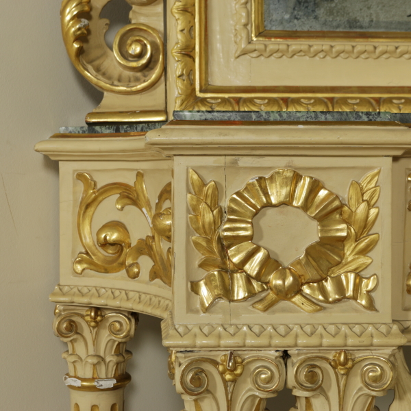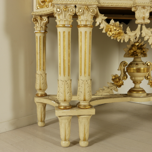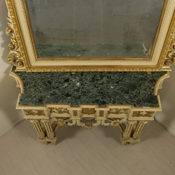 Importante consolle retta da sei gambe tornite e scanalate con capitelli intagliati e piano in marmo. Alta specchiera sagomata con cimasa con stemma araldico. Riccamente intagliata con festoni, nodi d'amore, fiori e volute fogliacee. Laccata e dorata.